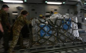 U.S. Air Force Staff Sgt. Jeanne Caron, 89th Airlift Squadron loadmaster, ushers in 24.7 metric tons of humanitarian aid destined for Gaza aboard a C-17 Globemaster III at an undisclosed airfield in the Middle East, Nov. 28, 2023. The U.S. Air Force’s rapid global mobility capability enables the expedited movement of critical, life-saving supplies throughout the Middle East. The U.S. Agency for International Development regularly coordinates with the U.S. Department of Defense to provide options to effectively transport millions of dollars of humanitarian aid where it is needed most. (U.S. Air Force photo by Staff Sgt. Jasmonet Holmes)