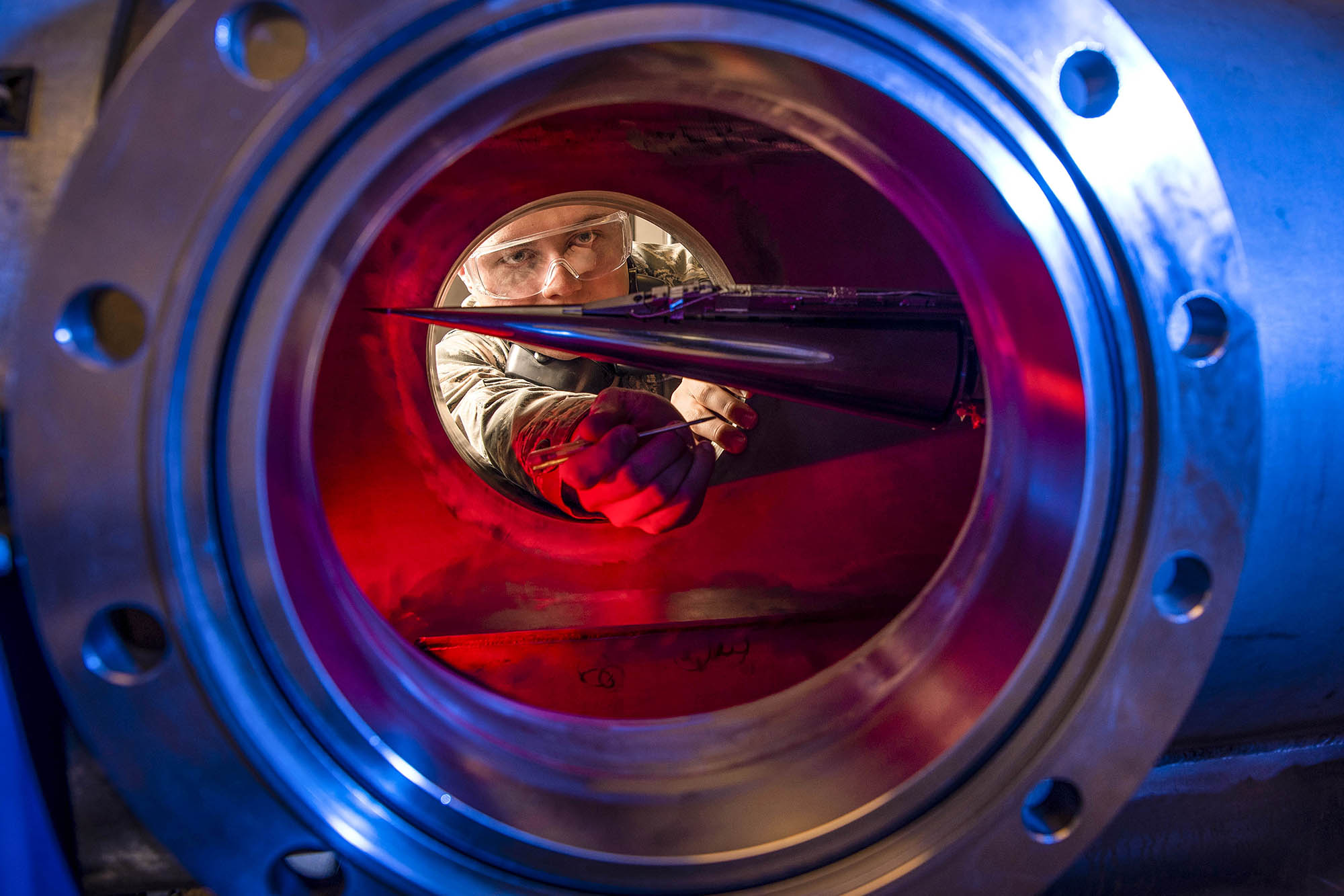 Cadet 2nd Class Eric Hembling peers into the US Air Force Academy’s new Ludwieg Tube, a compact Mach 6 wind tunnel that will aid in hypersonic research at the academy. USAFA stood up the Hypersonic Vehicle Simulation Institute in 2018, and cadets will participate in research this summer involving modeling and simulating the aero-thermodynamic characteristics of hypersonic vehicles.