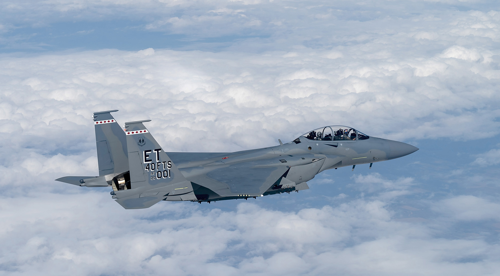 Lt. Col. Richard Turner, Commander, 40th Flight Test Squadron, and Lt. Col. Jacob Lindaman, Commander, 85th Test & Evaluation Squadron, deliver the first F-15EX Eagle II to its new home station, Eglin Air Force Base, Fla.