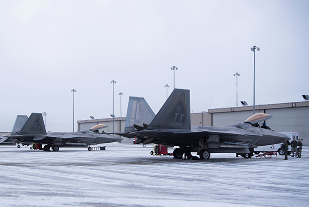 F-22s assigned to the 95th Fighter Squadron from Tyndall AFB, Fla., sit on the flightline after landing at JB Elmendorf-Richardson, Alaska, on Dec. 17, 2018. Air Force photo by A1C Caitlin Russell.