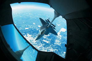 An F-22 takes on fuel from a KC-10 over Alaska. (USAF photo by A1C Jonathan Snyder) |