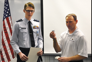 Fort Dodge Chapter VP Justin Faiferlick holds up the sky-blue ribbon of the AFA Civil Air Patrol Award. He presented it to Jacob Lewandowski (left). The award recognized Lewandowski as outstanding cadet in CAP’s Northwest Iowa Composite Squadron.