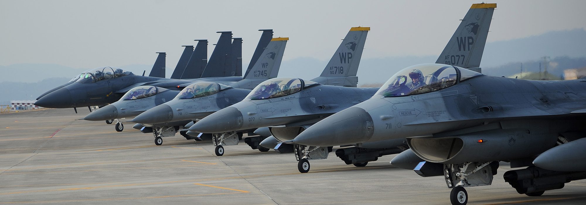 USAF F-16s and South Korean F-15s on the line at Daegu AB, South Korea, participating in Buddy Wing exercises to improve fighter interoperability. Photo: SrA. Devine Cox