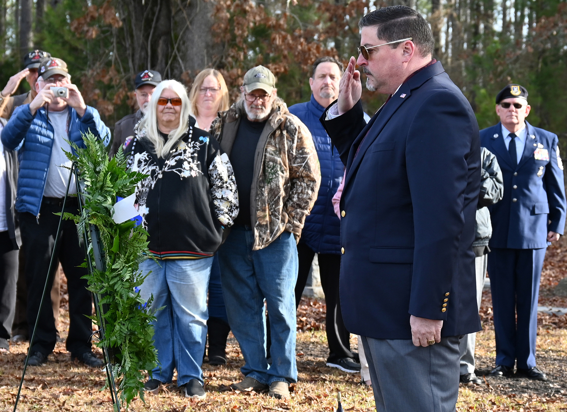 CMSgt. Paul Weseloh (Ret.), AFA Texoma Region, salutes after presenting a wreath at the grave of Staff Sgt. John Rucker. Senior Master Sgt. Patrick Nugent (Ret.)