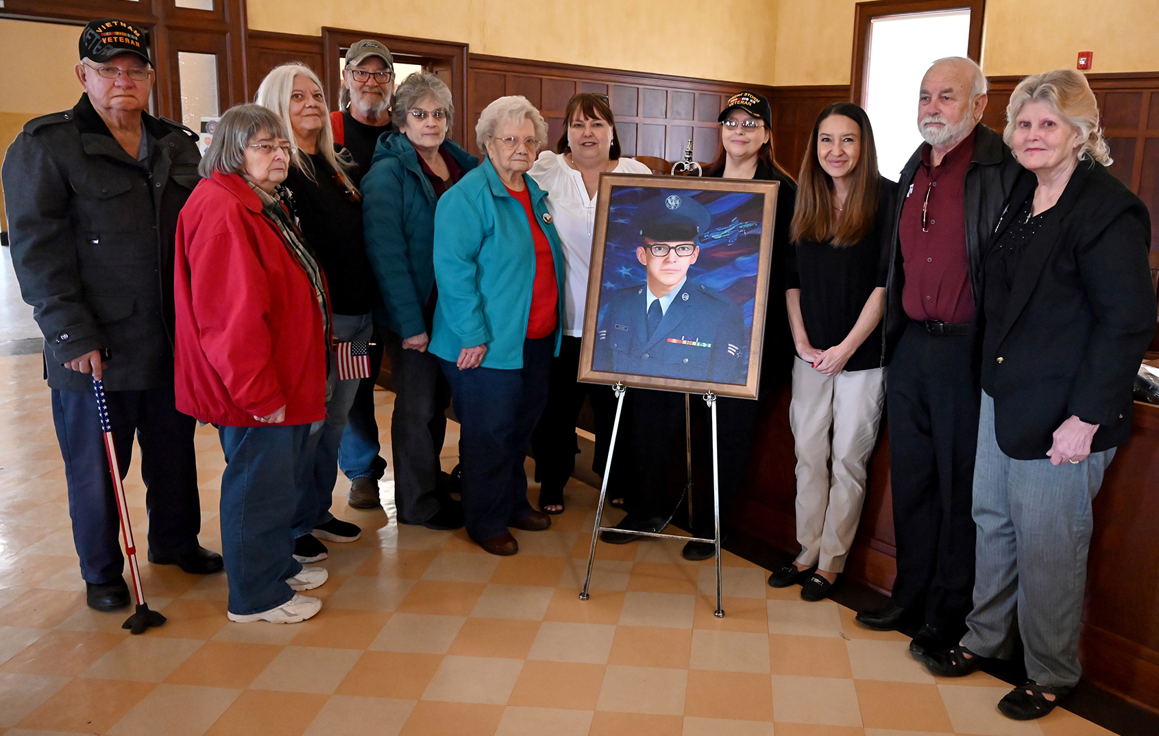 Family and relatives of Staff Sgt. John Rucker pose with his portrait at the unveiling ceremony taking place at the Linden courthouse. (L to r) Roger Manning, brother-in-law; Margie Manning, sister; Marsha Bradford, sister; Travis Bradford, brother-in-law; Rose Dulaney, cousin; Mae Rucker, mother; Vicki O’Neal, niece; Patti Rucker, niece; Tia McConnell, daughter; Dr. Vance Cortez Rucker, cousin; and Sandy Cortez Rucker, cousin-in-law. Senior Master Sgt. Patrick Nugent (Ret.)
