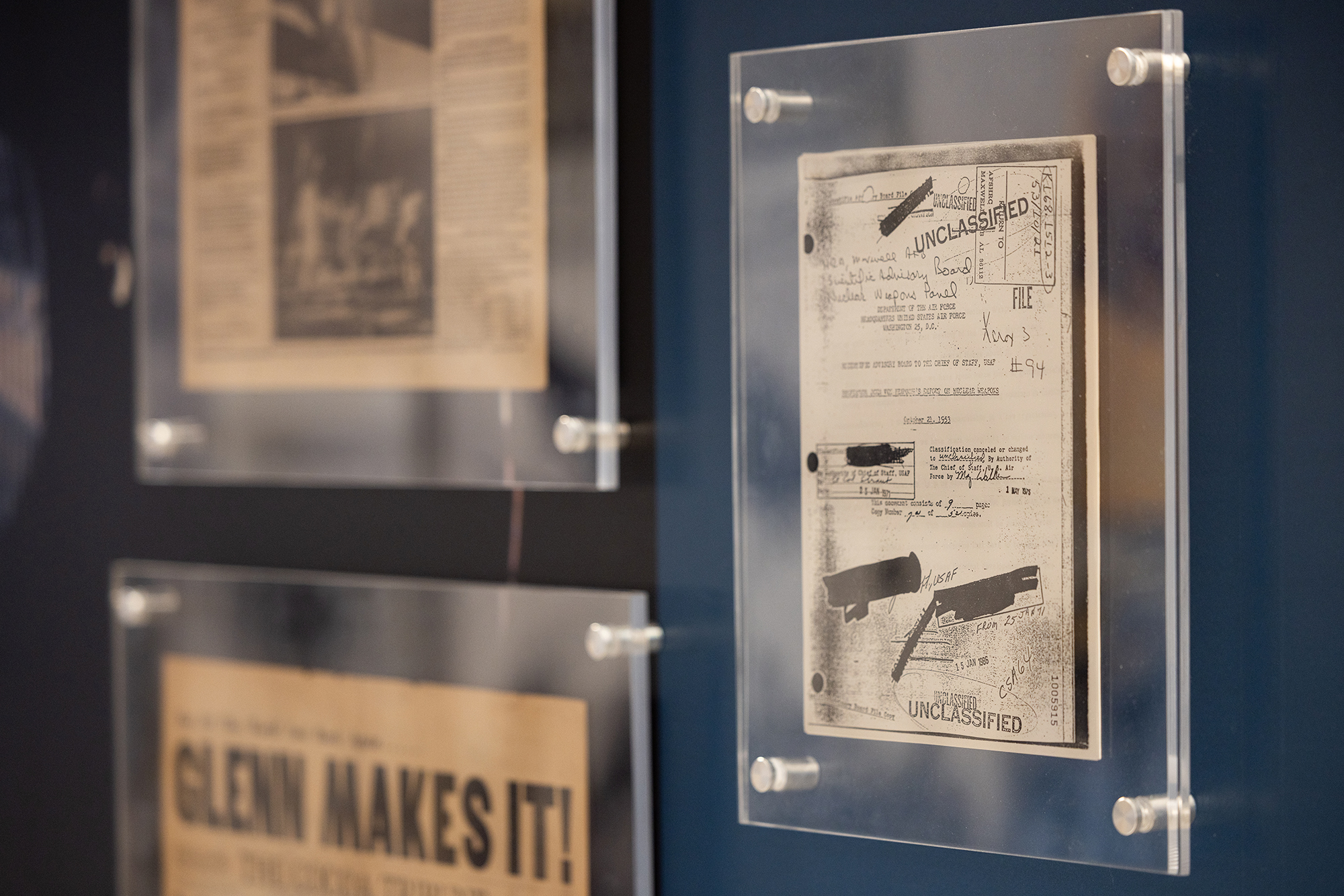 To enrich the historical depth and authenticity of the exhibit, Birkey contributed original artifacts and archival materials that connect visitors directly to the eras being represented—including a World War I propeller blade, a piece of a B-17, as well as control wheels from a B-47, B-52, and C-5. Items from AFA’s collections were also highlighted, like original newspapers covering the early days of the Space race, an Apollo 15 mission patch that was flown to the moon and back, along with key documents that tie to the founding of the Space Force. Deptula also added some very rare historical