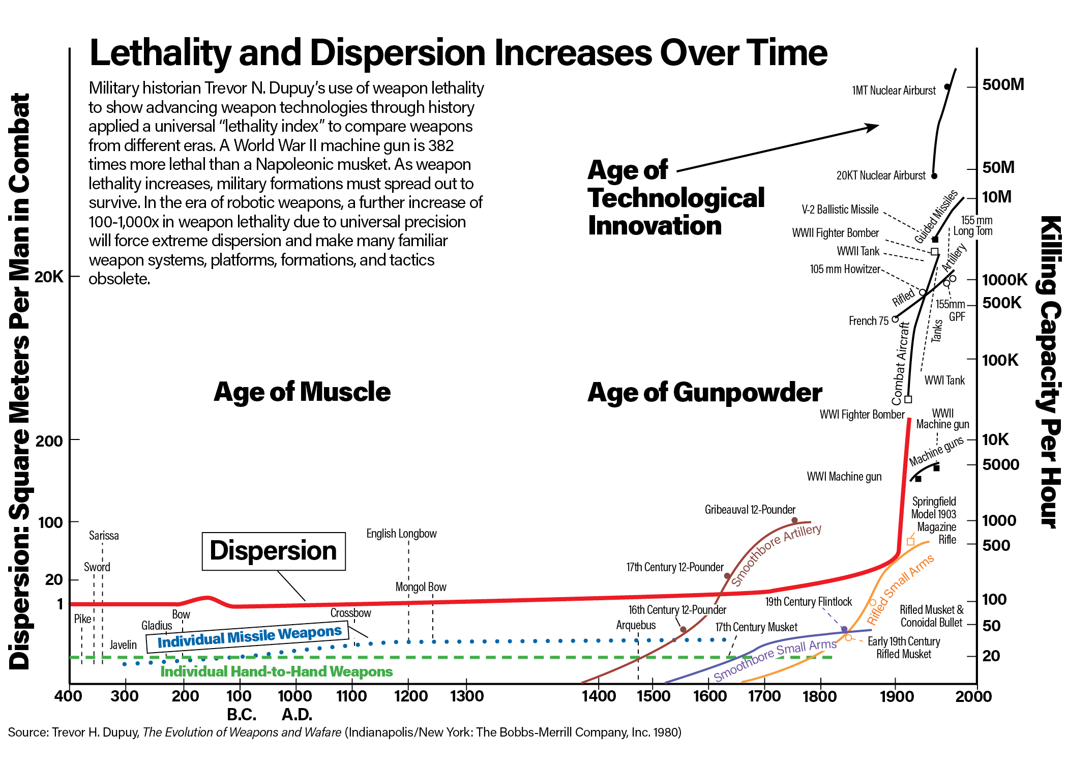 How significant will the consequences of this transition be? In 1964, military historian Trevor N. Dupuy introduced the concept of weapon lethality as a means for analyzing the effects of advancing weapon technologies through history. At the time, most military thinkers measured weapons by firepower, which was their output in terms such as rounds per minute, or by the throw weight of artillery shells per hour. Instead, Dupuy focused on their effects on the enemy. He defined weapon lethality as “the inherent capability of a given weapon to kill personnel or make materiel ineffective in a given period of time.” He proposed a universal “lethality index” that allowed weapons from different periods to be compared against each other. The smoothbore musket of the Napoleonic period received a lethality index score of 47. The late 1800s breech-loading rifle received a 229. The World War II-era machine gun received a lethality score of 17,980, due to its high rate of fire. The World War II 155 mm howitzer scored approximately half a million.