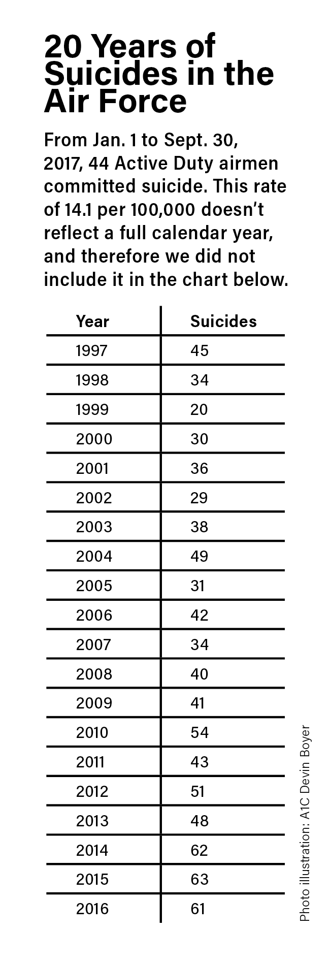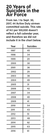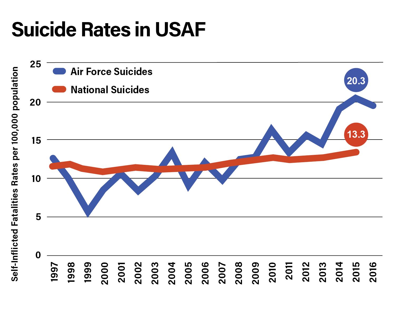 In 2015, airmen committed suicide at a rate of more than 20 per 100,000 population. Put another way, more than one in 5,000 airmen took their lives in a single year. This was the leading cause of death for airmen, the highest rate of the past 20 years, and the overall trend is rising. Not only is USAF’s suicide rate tragically high, the recent rates dwarf the national averages.