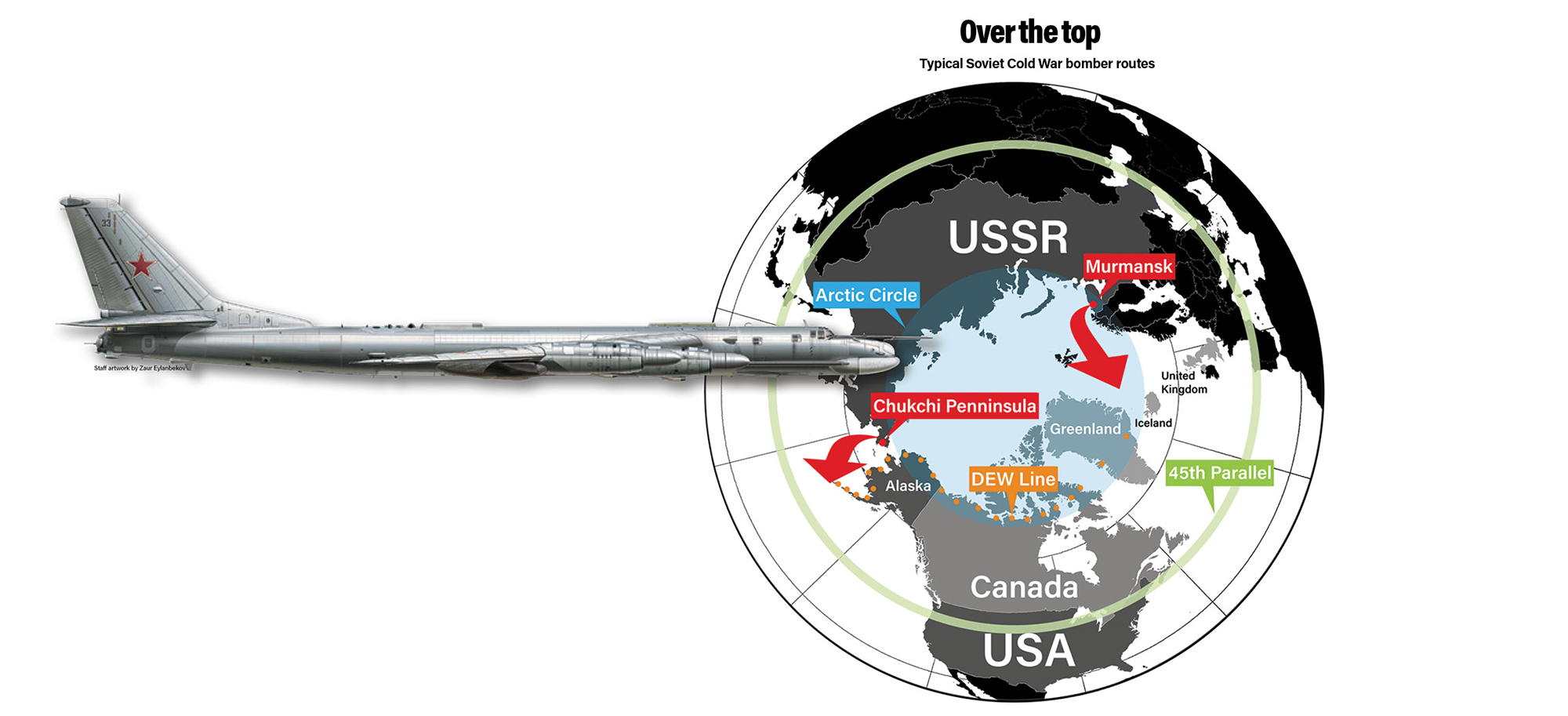 In 1946, the Army Air Forces stated a “polar concept,” which put air defense priority on the “polar approaches, namely the North Atlantic and Alaska.” In 1949, the Joint Chiefs of Staff declared that all nations capable of waging war on the United States lay north of the 45th parallel—defining, in effect, the Soviet Union as the threat—and that the shortest attack route was across the polar region.