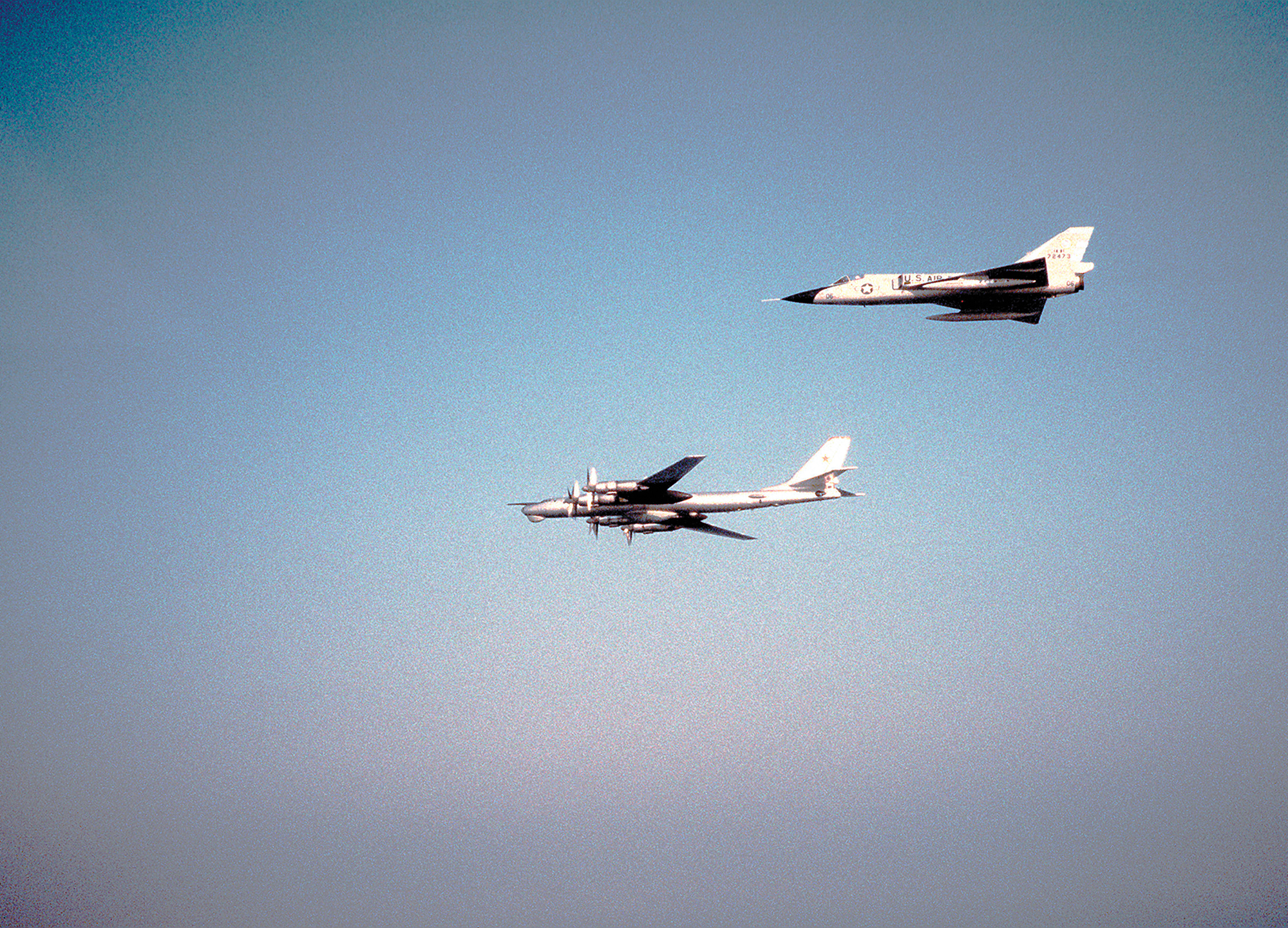 In the beginning, the fighters were usually USAF F-102s or F-106s. Later they were F-4s and F-15s. Sometimes the aircraft they intercepted was a Tu-16 Badger, or on occasion an M-4 Bison. By far, however, the intruder intercepted with the greatest frequency was the Tu-95 Bear. (Bear, Badger, Bison, etc., are all code names used by NATO.)