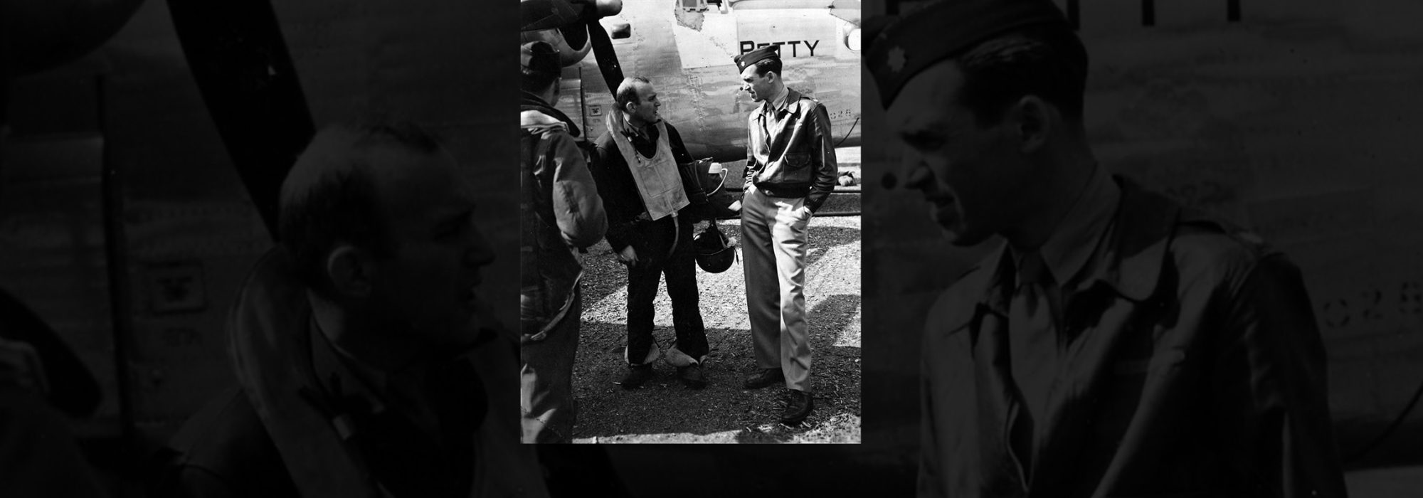 Maj. Jimmy Stewart confers with a B-24 crew member. USAF Photo