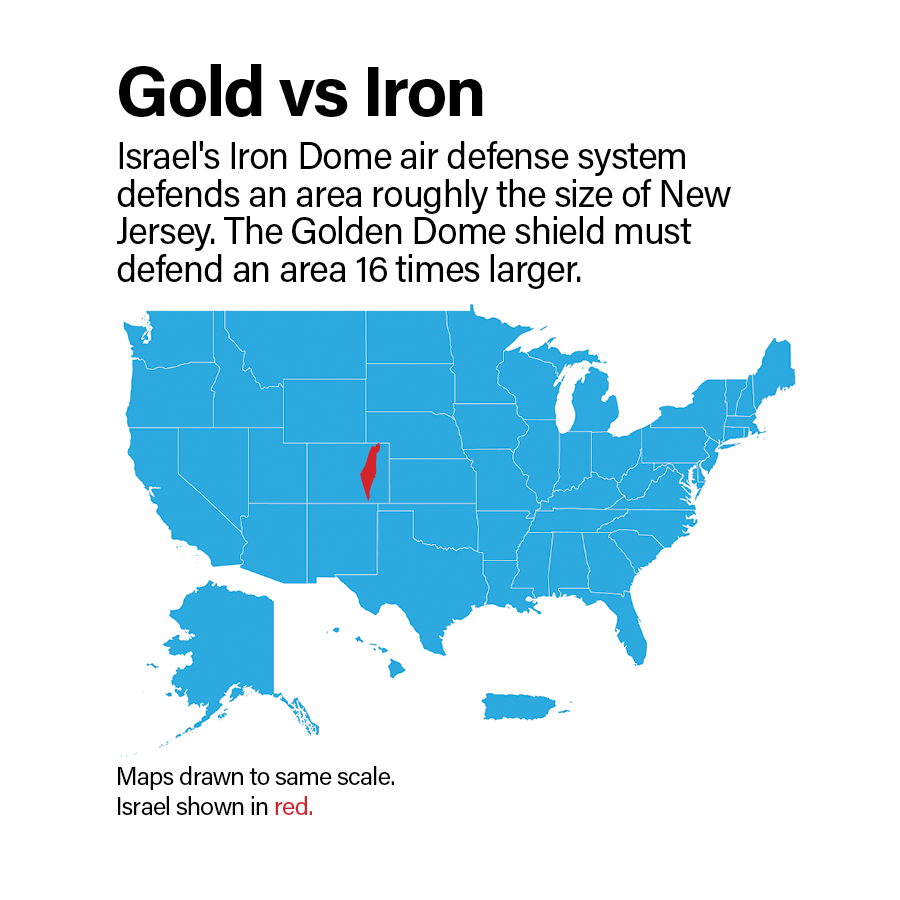While the United States aspires to creating a protective scheme akin to Israel’s Iron Dome, the scale of the challenge is significantly greater: Israel defends 834 miles of border (664 miles on land and 170 miles on the seashore). By contrast, the U.S. must defend a territory roughly 16 times as large: 13,699 miles of border (7,896 miles on land and 5,893 miles of coastline). Add in Alaska, Hawaii, U.S. possessions and close allies and that balloons to as much as double the territory. The threat picture is also growing with hypersonic missile threats, mass cruise missiles and UAV volleys and UAV swarms that make creating an effective shield that much harder. The three most challenging elements for Golden Dome will be: (1) The ability to intercept concentrated missile volleys attacking small geographic penetration points without exhausting its defensive capabilities; (2) The ability to affordably field enough space-based interceptors to be effective when our adversary can choose the engagement timeline; and (3) The ability to provide an effective battle management command, control & communications (BMC3) capability to handle these complexities.
