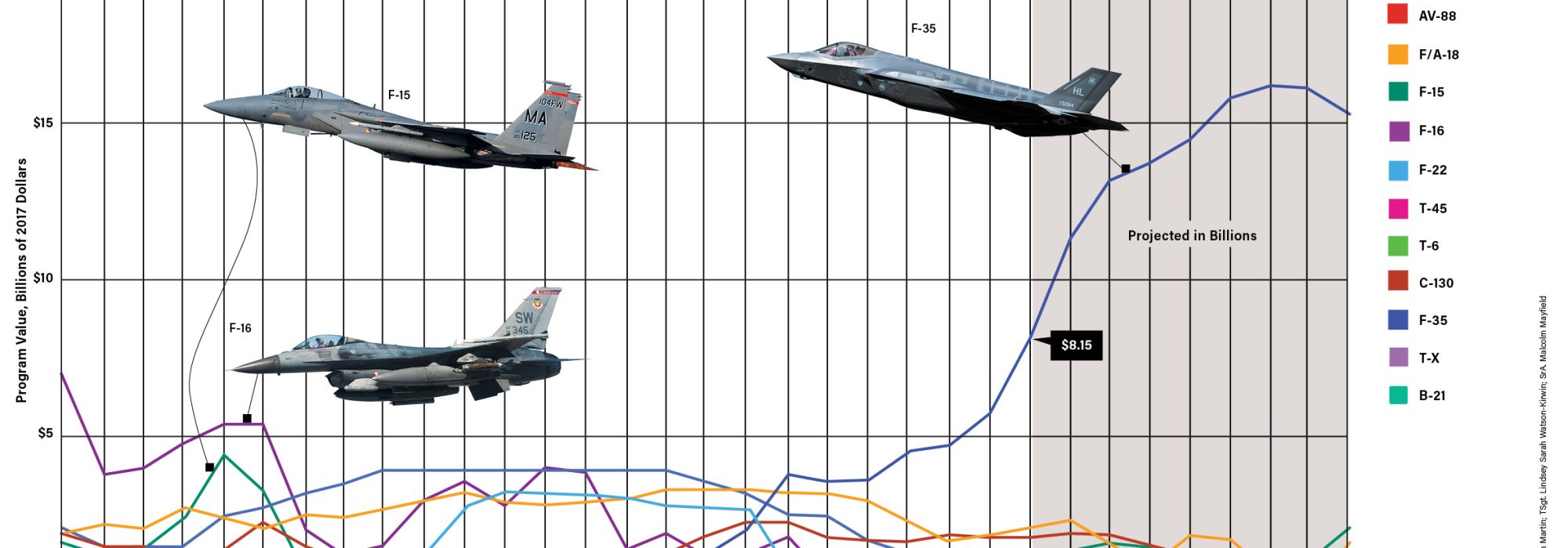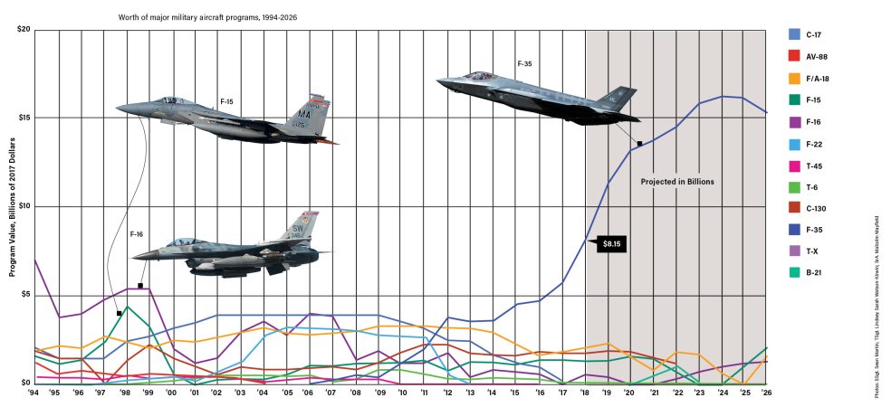 That’s according to data from the DC-based Teal Group, a think tank with expertise in the market impact of military programs. The data breaks down total market values of major fixed-wing aircraft programs, ranging from the F-15 to the B-21—from 1994 through today—and projects those values into the future through 2026. All amounts are adjusted to 2017 dollars.