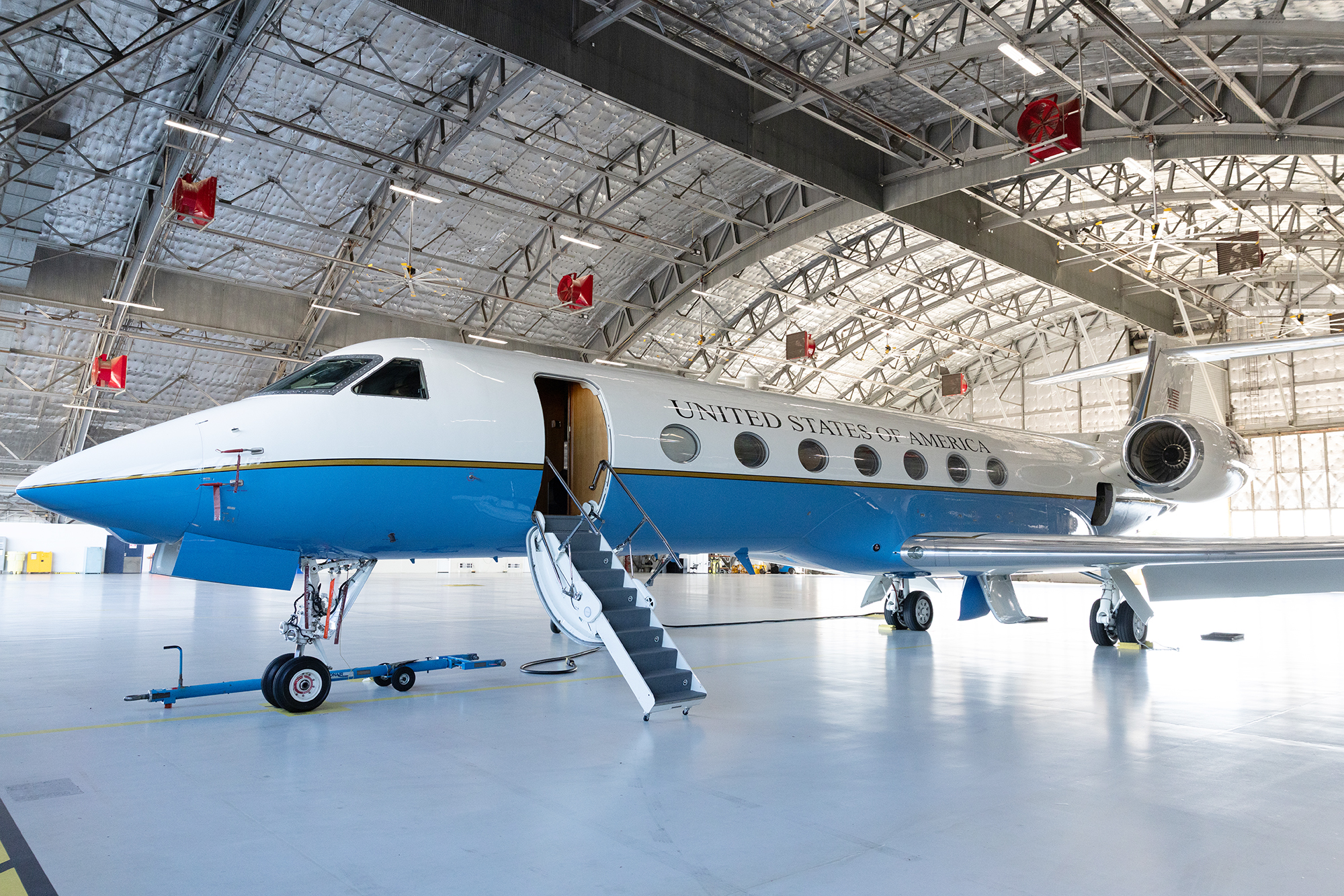 The wing’s primary workhorse is the C-37, often seen parked on a main flight line at Andrews. While most are painted blue and white, a few jets sport discreet all-white liveries. The 11 C-37s come in two variants: The A model is a modified Gulfstream V, the oldest of which are approaching 30 years old, while the newer C-37B is a modified Gulfstream 550 with greater range and fuel efficiency. These jets can fly high and fast, cruising at 50,000 feet, above most weather and commercial traffic, despite its compact airframe.