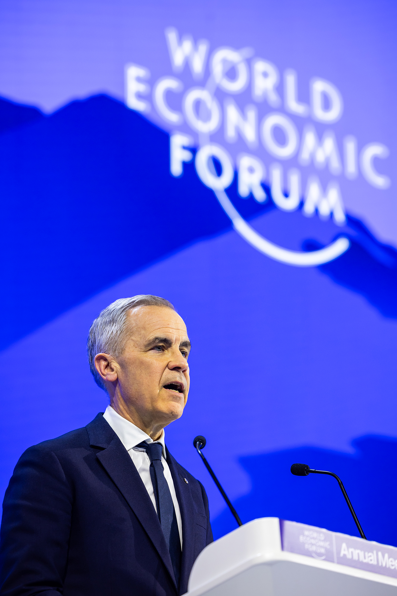 Canadian Prime Minister Mark Carney at the Davos World Economic Forum, calling for the middle powers to work together to build a more resilient world [Jan. 20].