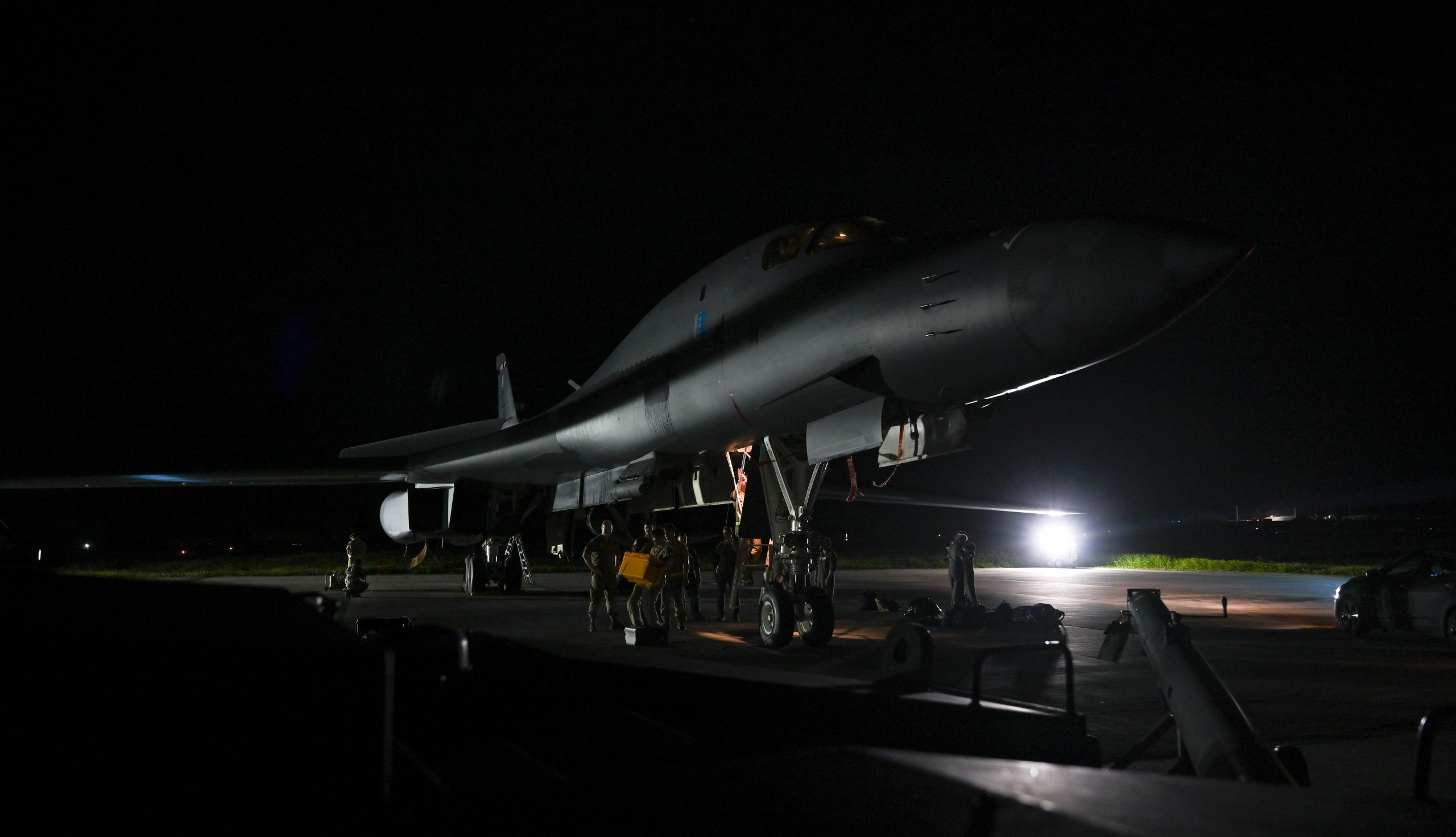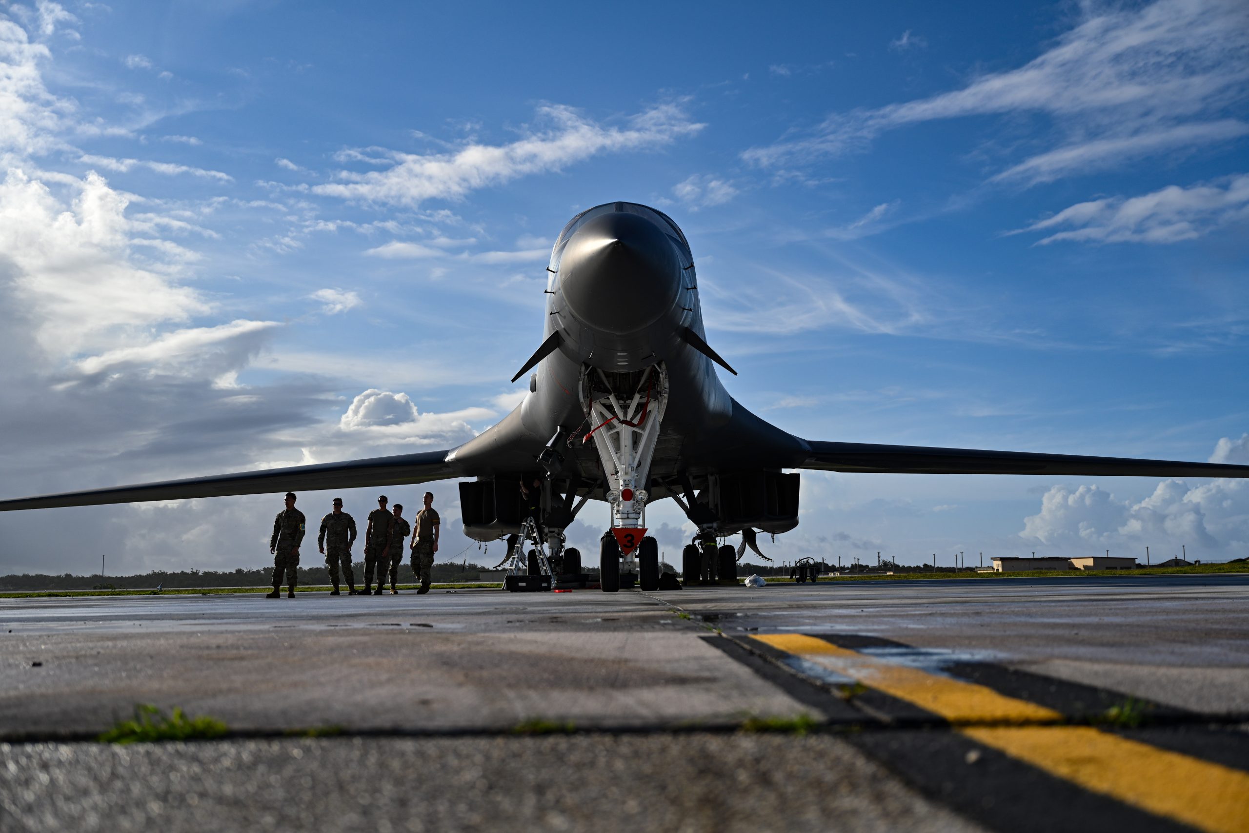 Aircrew from the 37th Expeditionary Bomb Squadron off-load a B-1B Lancer at Andersen Air Force Base, Guam, May 23, 2024, in support of a Bomber Task Force mission. BTF missions enable crews to maintain a high state of readiness and proficiency and validate our always-ready global strike capability. The U.S. routinely and visibly demonstrates commitment to our allies and partners through the global employment of our military forces. (U.S. Air Force photo by Airman 1st Class Dylan Maher)