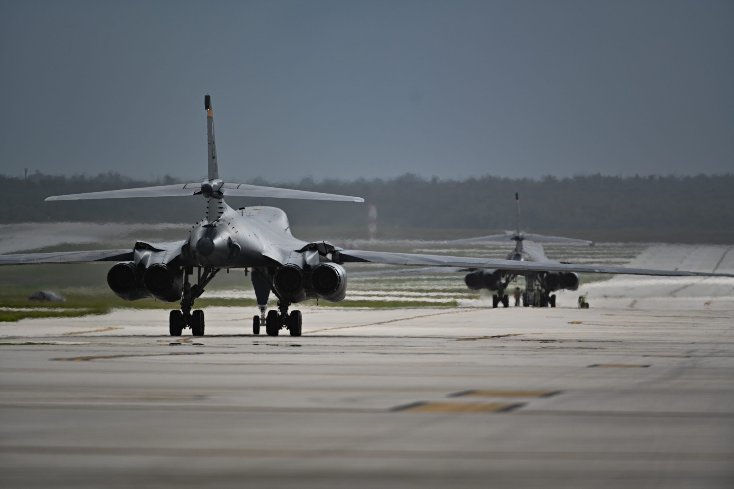 Two U.S. Air Force B-1B Lancers assigned to the 37th Expeditionary Bomb Squadron from Ellsworth Air Force Base, South Dakota, taxi on the flightline at Andersen Air Force Base, Guam, May 21, 2024, in support of a Bomber Task Force mission. Bomber missions support national security objectives through the speed, flexibility, and readiness of our strategic bombers. (U.S. Air Force photo by Staff Sgt. Jake Jacobsen)