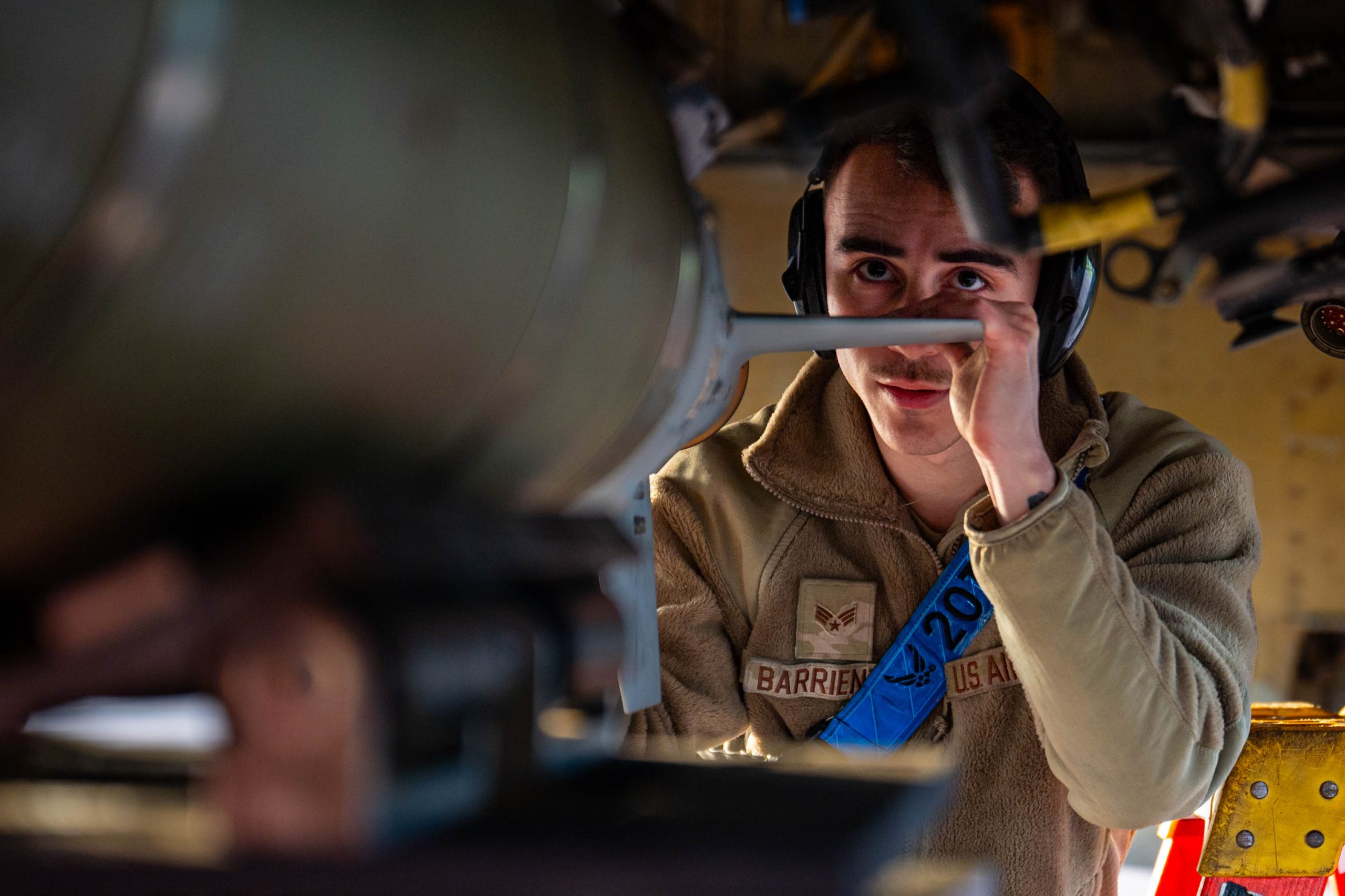 Senior Airman Devin Barrientos, 20th Expeditionary Bomb Squadron weapons load crew member, prepares to load a GBU-38 Joint Direct Attack Munition onto a B-52H Stratofortress during Bomber Task Force 25-1, at RAF Fairford, England, Nov. 13, 2024. Strategic bomber missions enhance the readiness and training necessary to respond to any potential crisis or challenge across the globe. (U.S. Air Force photo by Senior Airman Mary Bowers)