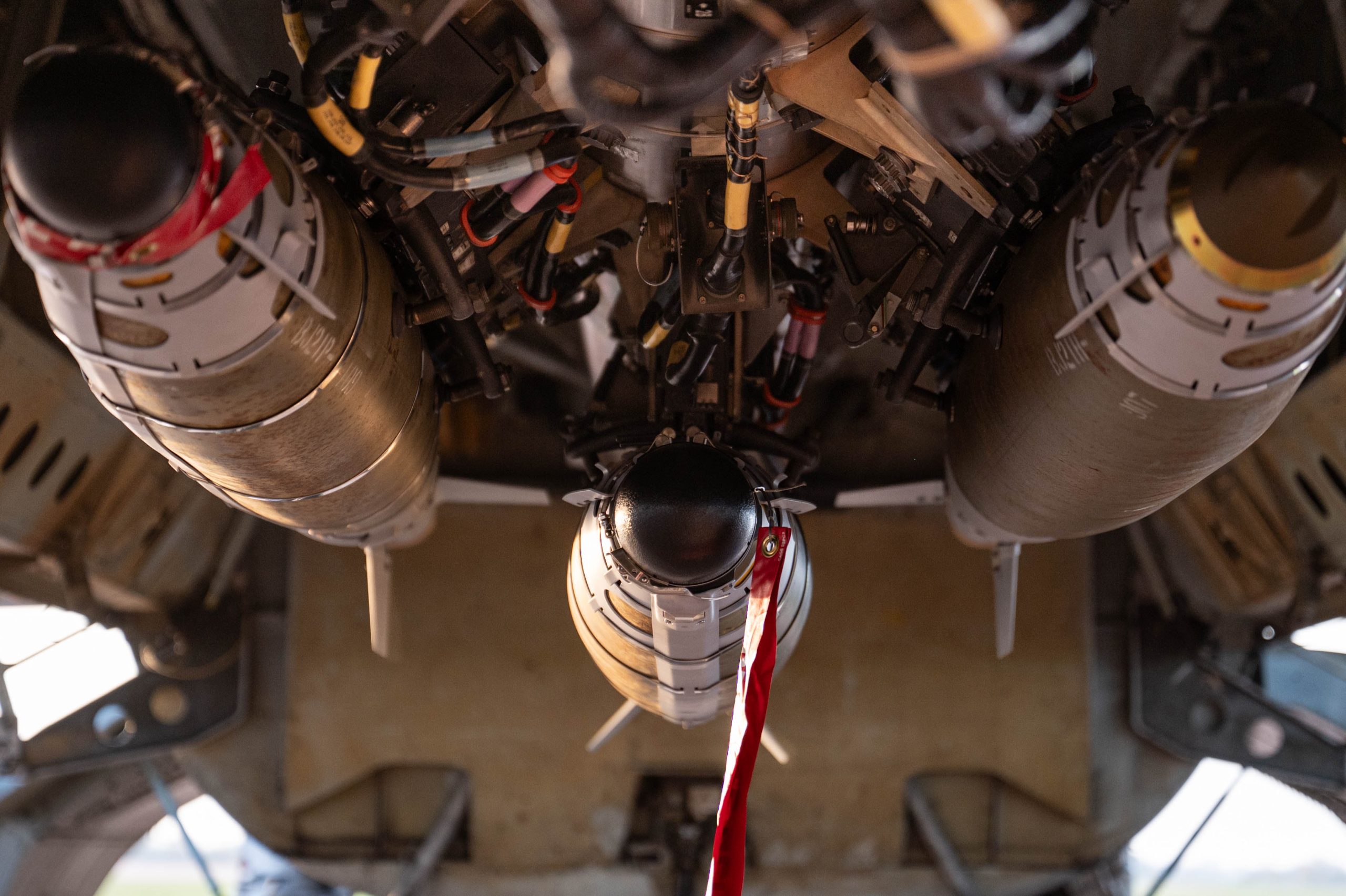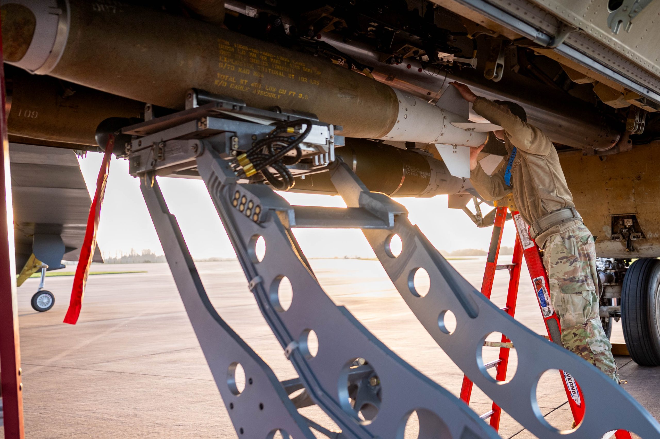 A GBU-38 Joint Direct Attack Munition is prepared to be secured in the bomb bay of a B-52H Stratofortress during Bomber Task Force 25-1, at RAF Fairford, England, Nov. 13, 2024. Through our strategic bomber missions, the U.S. demonstrates its ability to address the evolving and unpredictable security challenges of today’s global landscape. (U.S. Air Force photo by Senior Airman Mary Bowers)