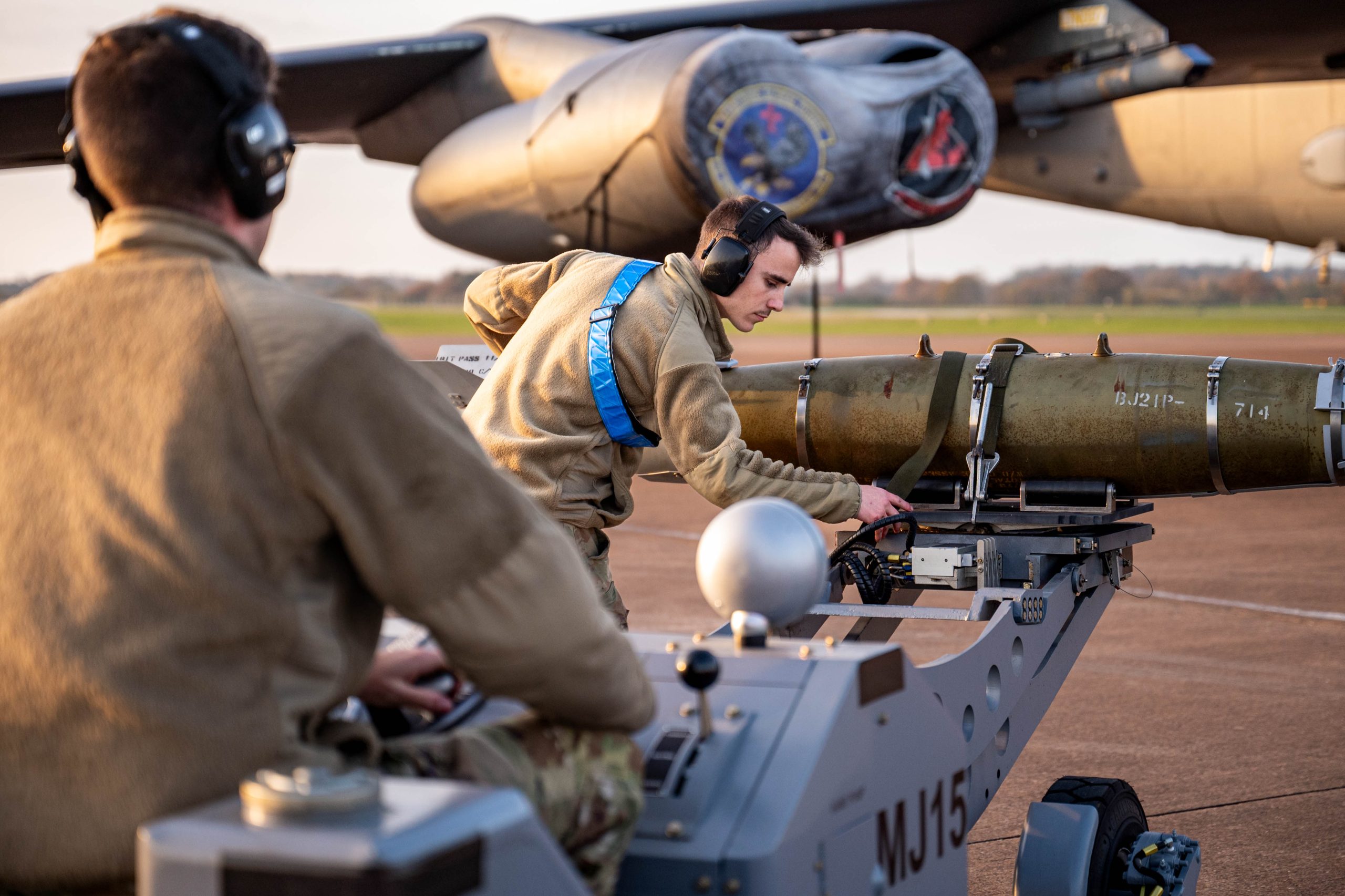 Senior Airman Zachary Dawson and Devin Barrientos, 20th Expeditionary Bomb Squadron weapons load crew members, prepare to load a GBU-38 Joint Direct Attack Munition onto a B-52H Stratofortress during Bomber Task Force 25-1, at RAF Fairford, England, Nov. 13, 2024. The operational readiness of U.S. forces across all domains is critical to building partnerships, responding to crises, providing deterrence, and supporting our Allies and partners. (U.S. Air Force photo by Senior Airman Mary Bowers)