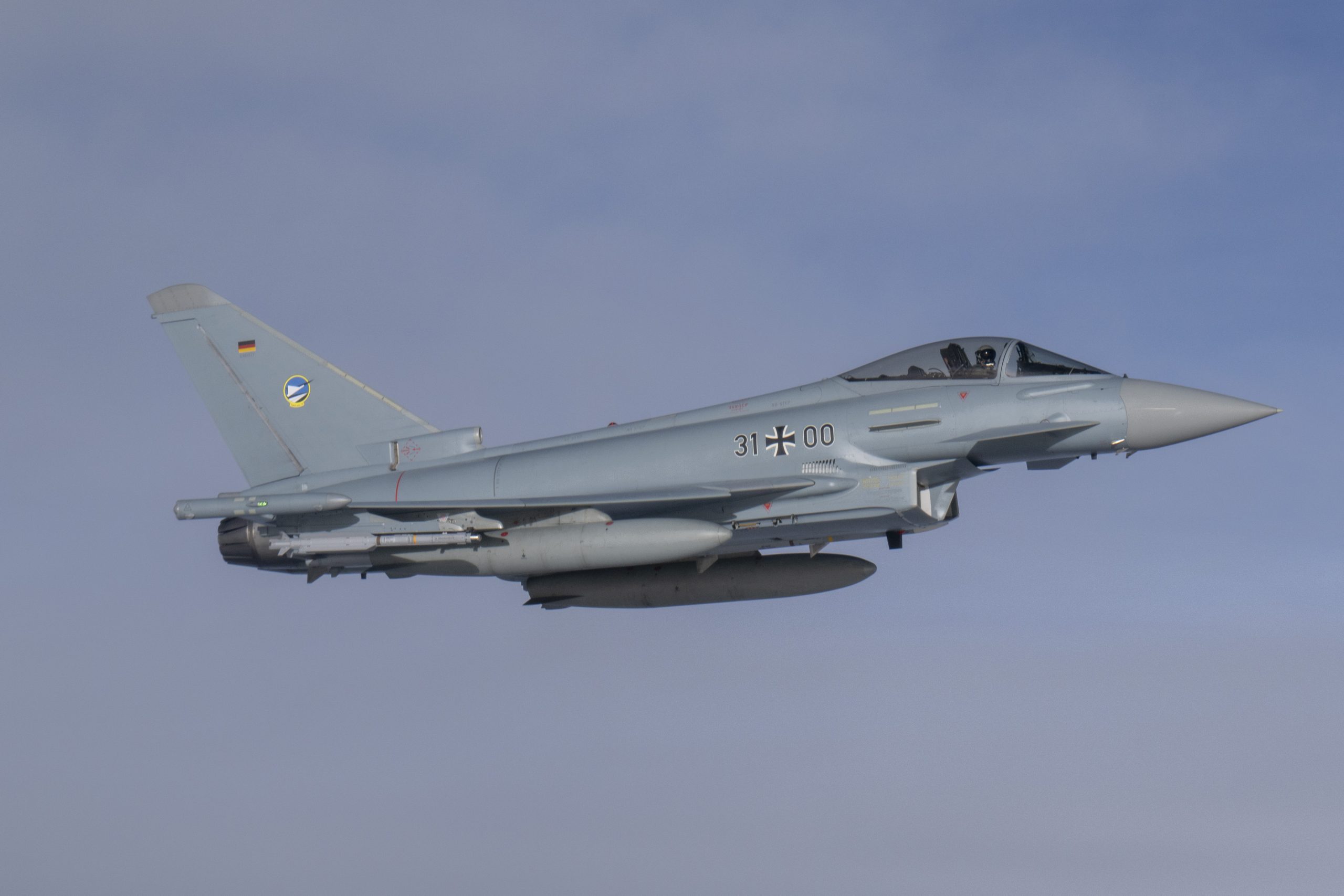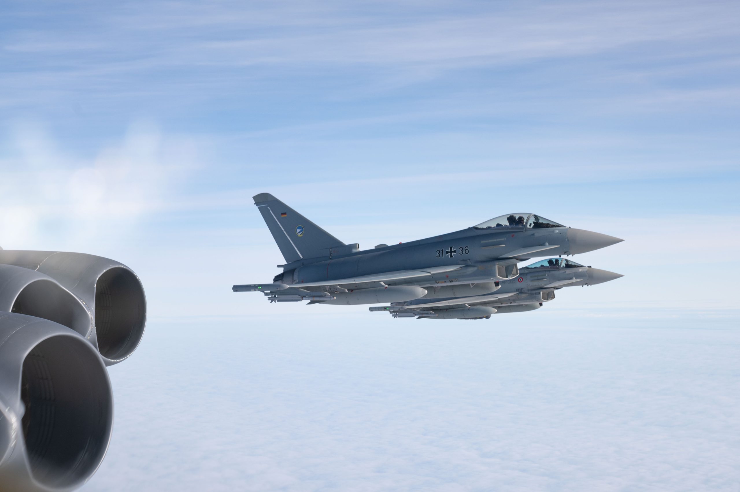 A U.S. Air Force B-52H Stratofortress assigned to the 20th Expeditionary Bomb Squadron is escorted by German Air Force and Italian Air Force Eurofighter Typhoons above the Baltic Sea during Bomber Task Force 25-1, Nov. 15, 2024. The U.S. is dedicated to working alongside our NATO Allies and partners in the Baltic Sea area to ensure all parties have the combined skills and coordination capabilities necessary to maintain regional safety and security. (U.S. Air Force photo by Senior Airman Jacob Cabanero)