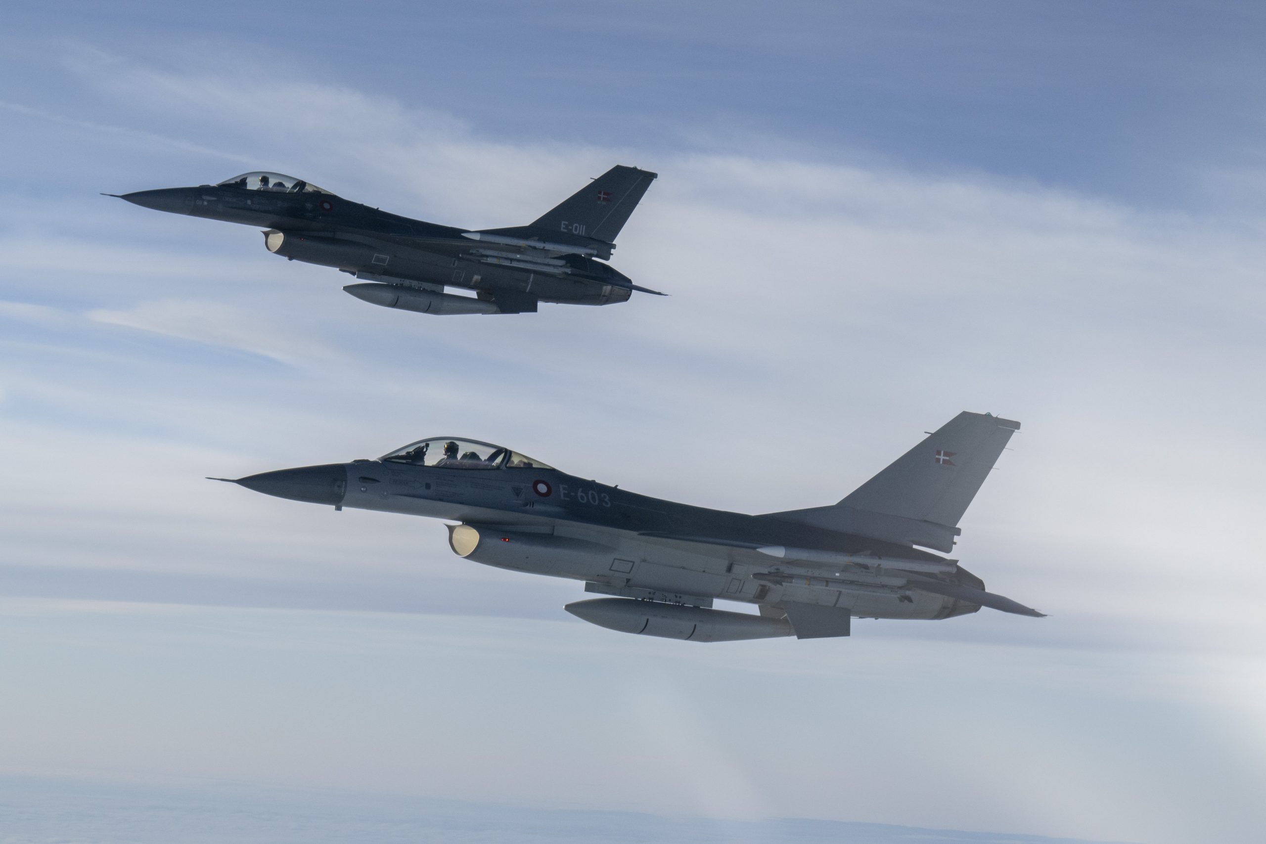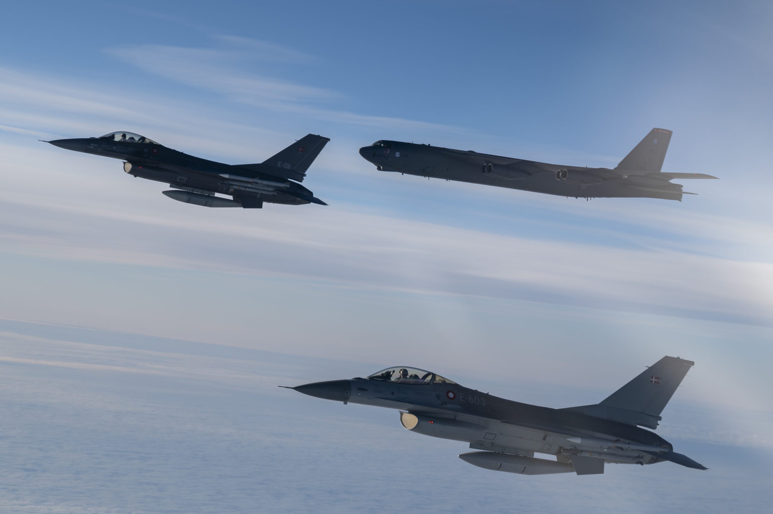Royal Danish Air Force F-16 Fighting Falcons fly off the wing of a U.S. Air Force B-52H Stratofortress, assigned to the 20th Expeditionary Bomb Squadron, during a Bomber Task Force Europe 25-1 mission over the U.S. European Command area of responsibility, Nov. 15, 2024. Joint and combined training operations underscore the United States’ dedication to maintaining a robust and ready Euro-Atlantic Alliance. (U.S. Air Force photo by Staff Sgt. Emily Farnsworth)