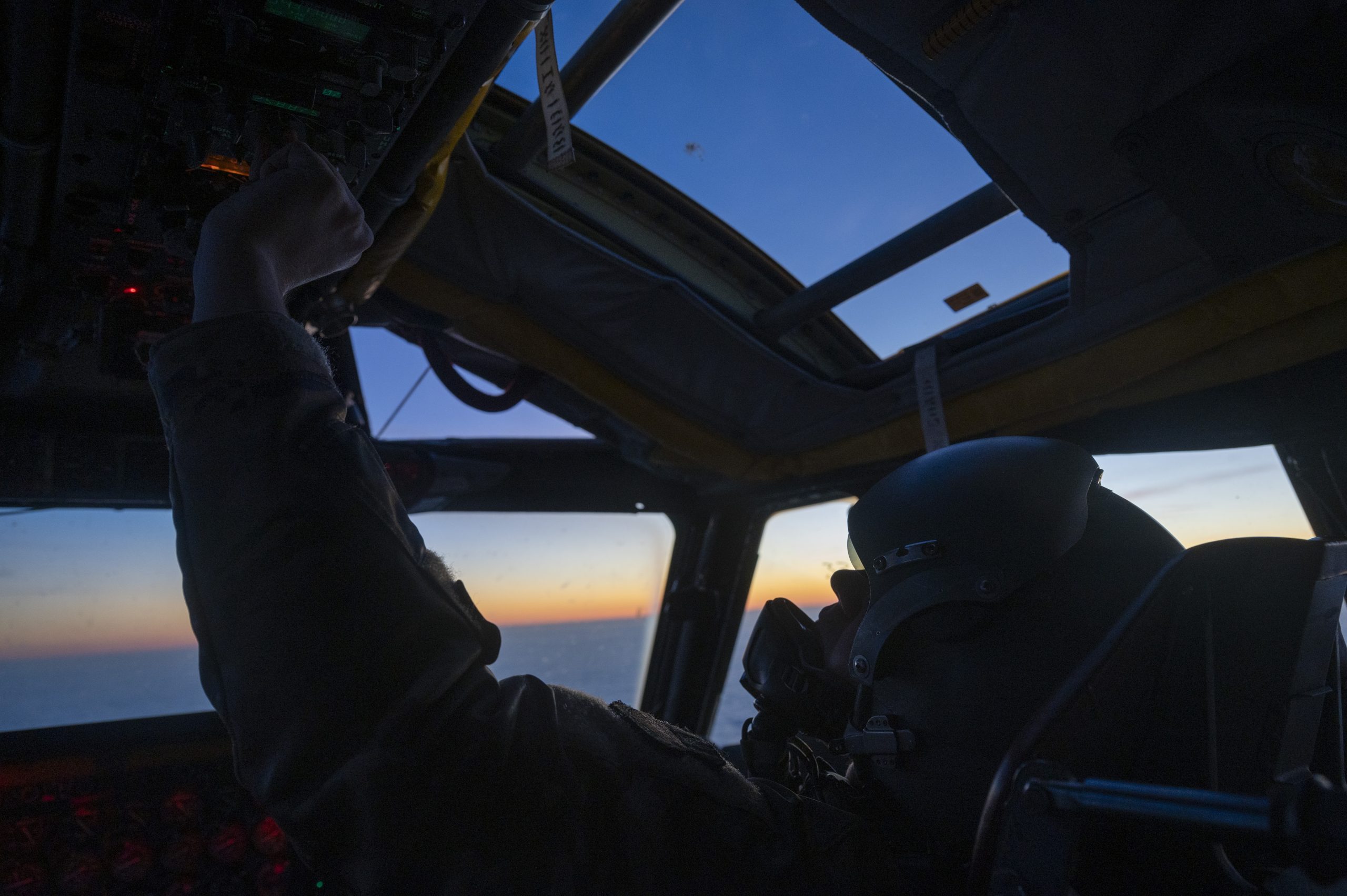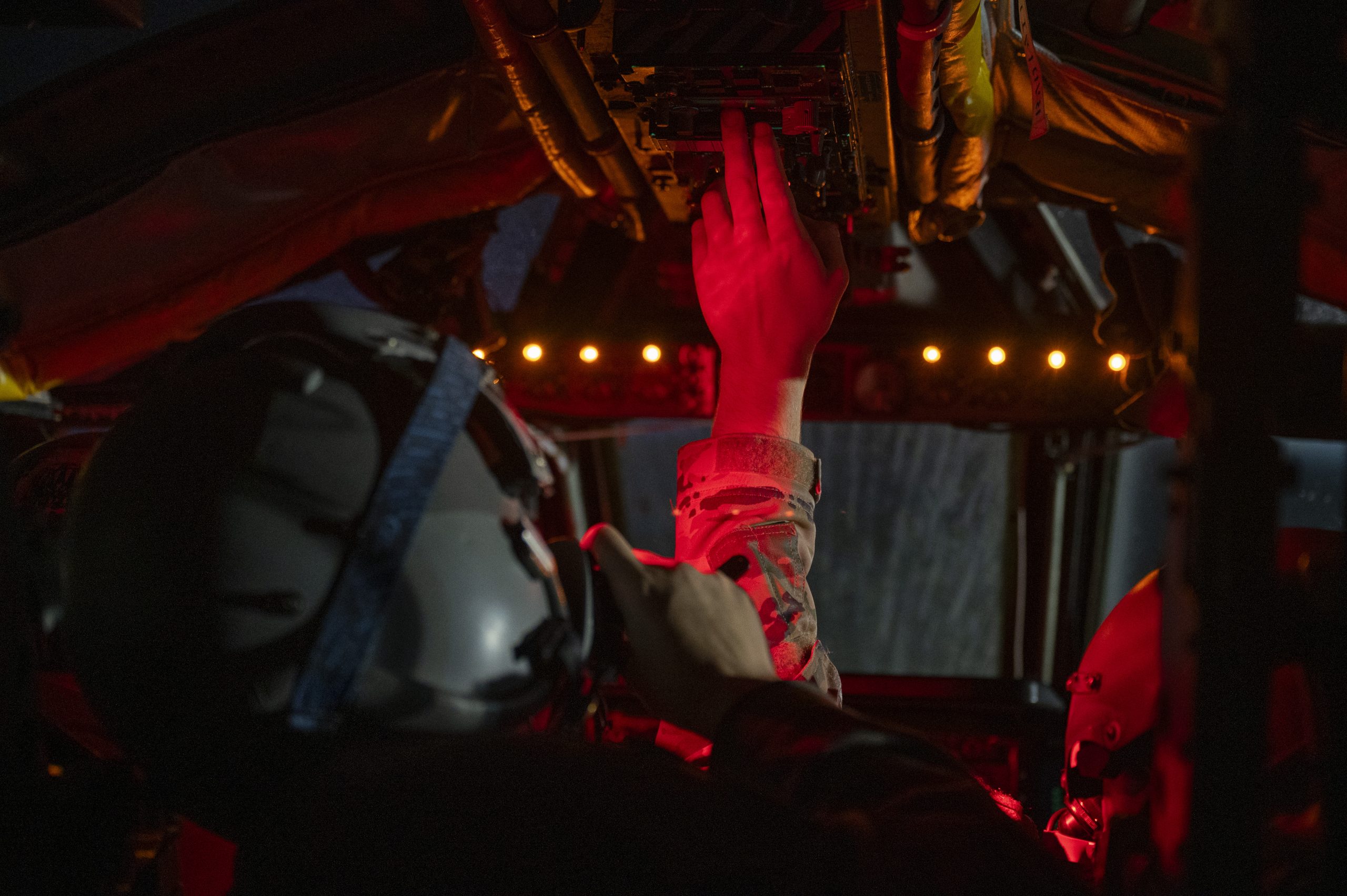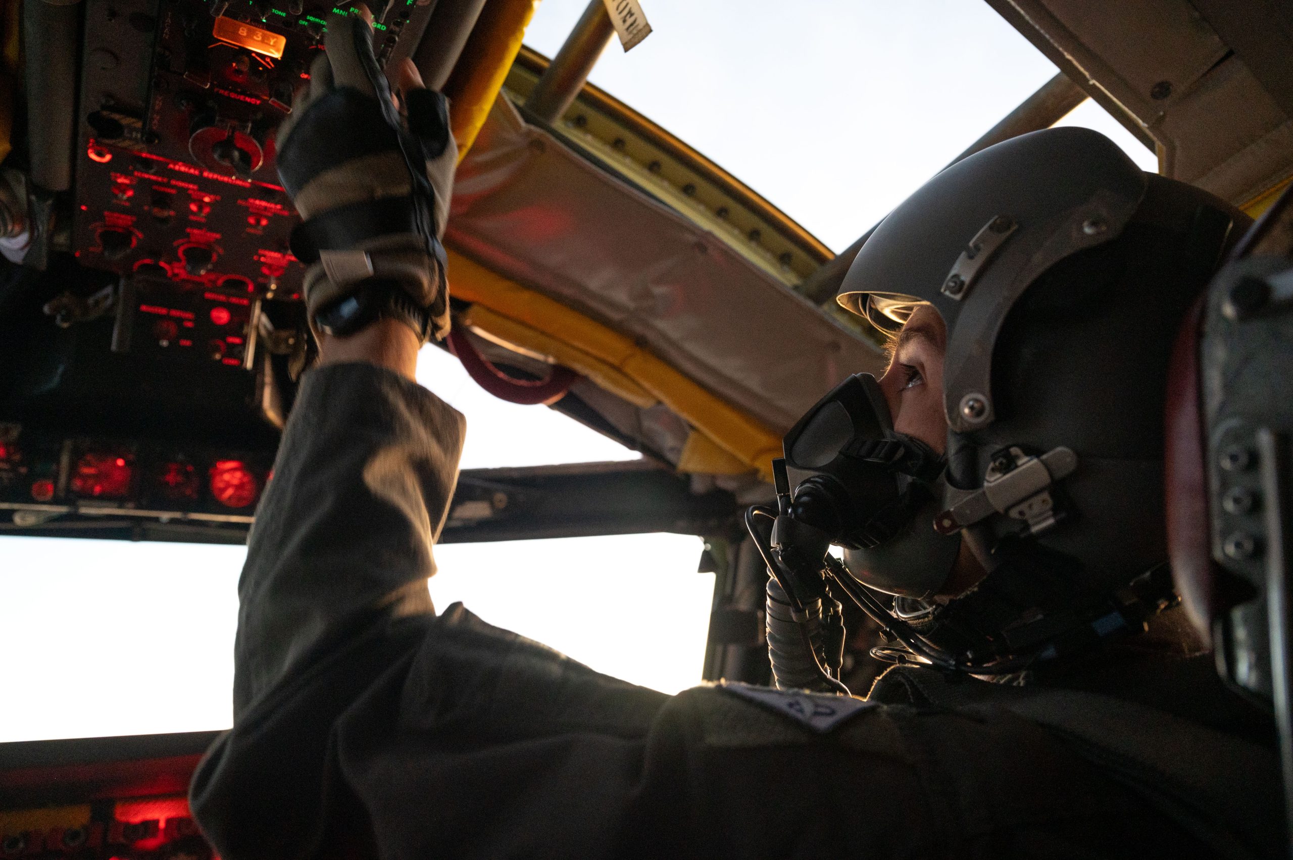 U.S. Air Force Capt. Christopher Henley, 20th Expeditionary Bomber Squadron pilot, sets radios in a U.S. Air Force B-52H Stratofortress, during a Bomber Task Force Europe 25-1 mission over the U.S. European Command area of responsibility, Nov. 15, 2024. NATO Allies and partners stand together in support of a safe, stable, and secure Euro‐Atlantic region by increasing military capabilities, readiness, and interoperability. (U.S. Air Force photo by Staff Sgt. Emily Farnsworth)