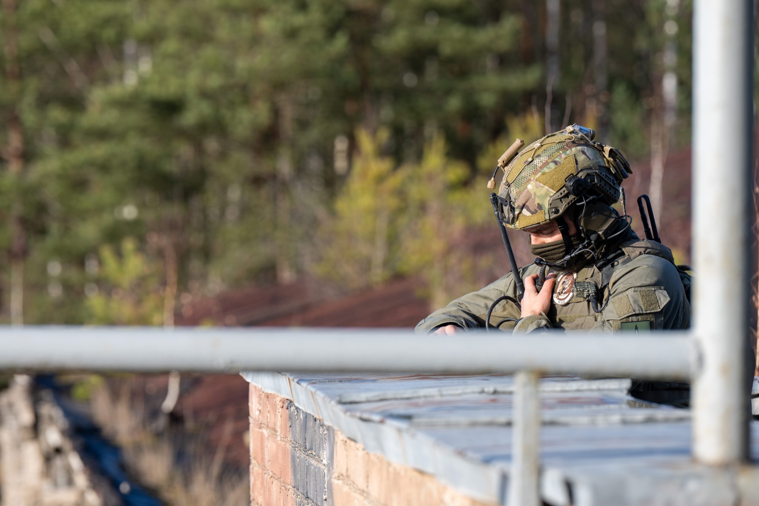 A Lithuanian Joint Terminal Attack Controller coordinates on the radio during exercise Vanguard Merlin at Cudgel Range, Lithuania, Nov. 15, 2024. Bomber Task Force 25-1 is a demonstration of collaboration, cooperation, integration and solidarity to promote peace and security. (U.S. Air Force photo by Senior Airman Vaughn Weber)