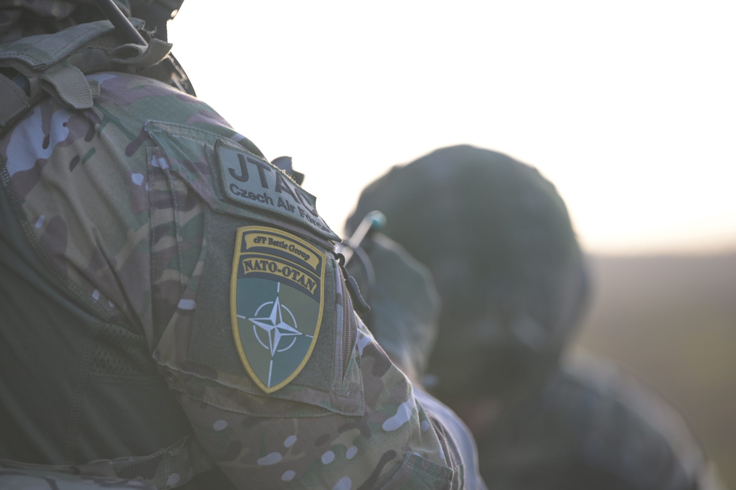 A NATO patch is displayed on the uniform of a Czech Joint Terminal Attack Controller during exercise Vanguard Merlin at Cudgel Range, Lithuania, Nov. 15, 2024. Bomber Task Force missions enable crews to maintain a high state of readiness proficiency and validate our always-ready, global strike capability. (U.S. Air Force photo by Staff Sgt. Essence Myricks)