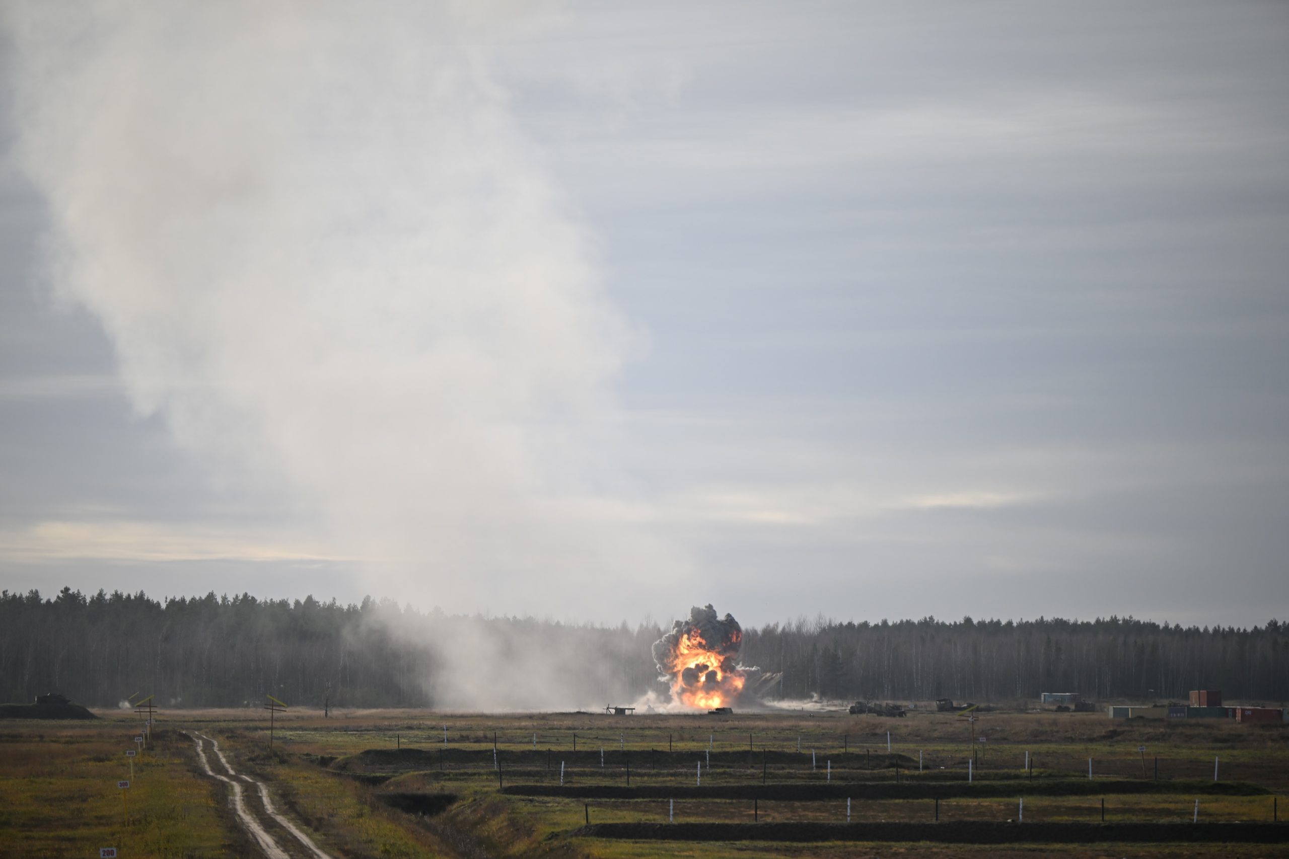A bomb detonates during the Bomber Task Force 25-1, exercise Vanguard Merlin at Cudgel Range, Lithuania, Nov. 15, 2024. BTF 25-1 is part of a long‐term multinational training plan to maintain readiness and interoperability between NATO Allies and partner nations in the Baltic Sea region. (U.S. Air Force photo by Staff Sgt. Essence Myricks)