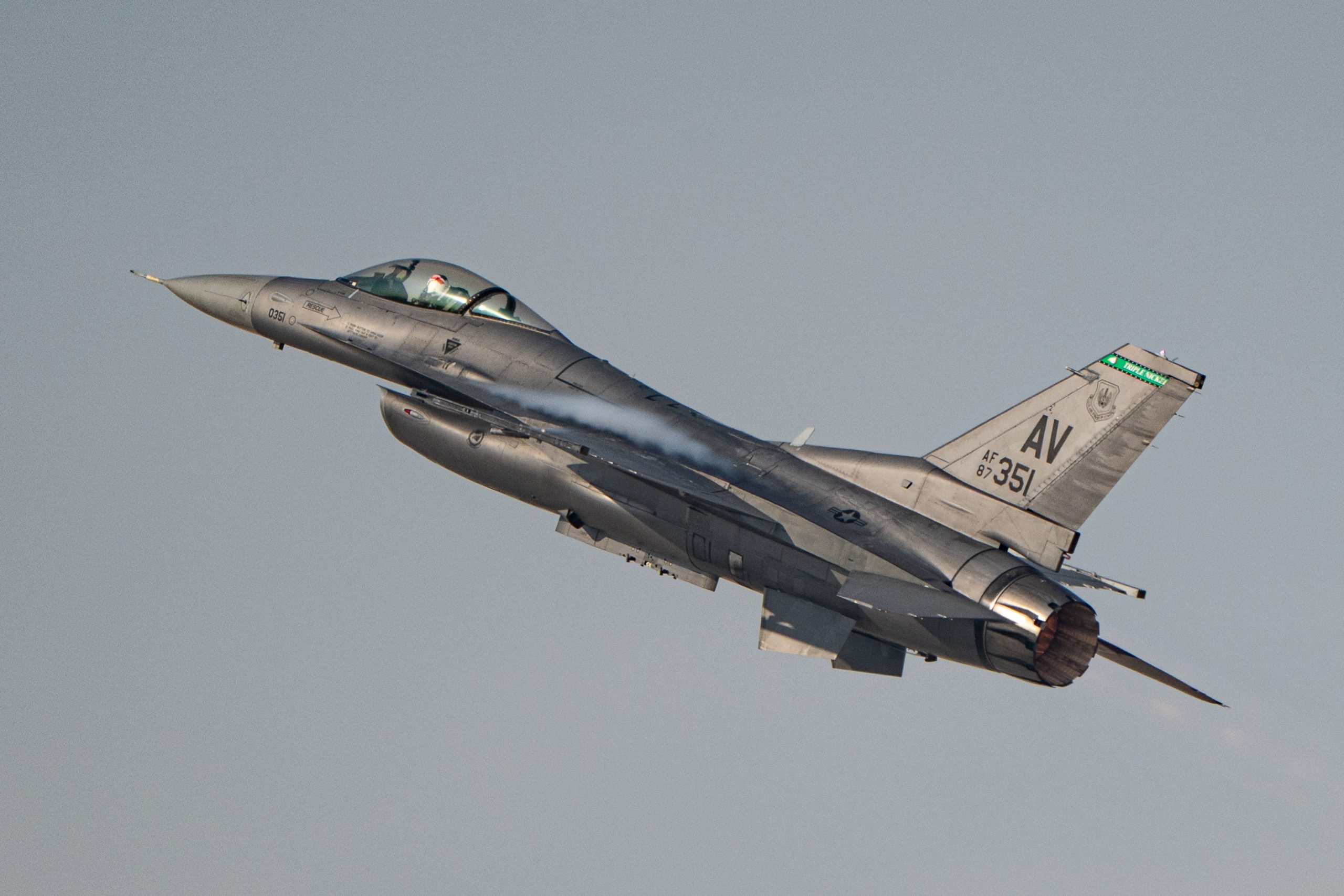 A U.S. Air Force F-16C Fighting Falcon assigned to the 555th Fighter Squadron at Aviano Air Base, Italy, performs aerial maneuvers Nov. 15, 2025, over Al Maktoum International Airport in Dubai, United Arab Emirates. The multi-role fighter aircraft rehearsed its performance prior to the Dubai Airshow 2025. (U.S. Air Force photo by Tech. Sgt. Justin Norton)