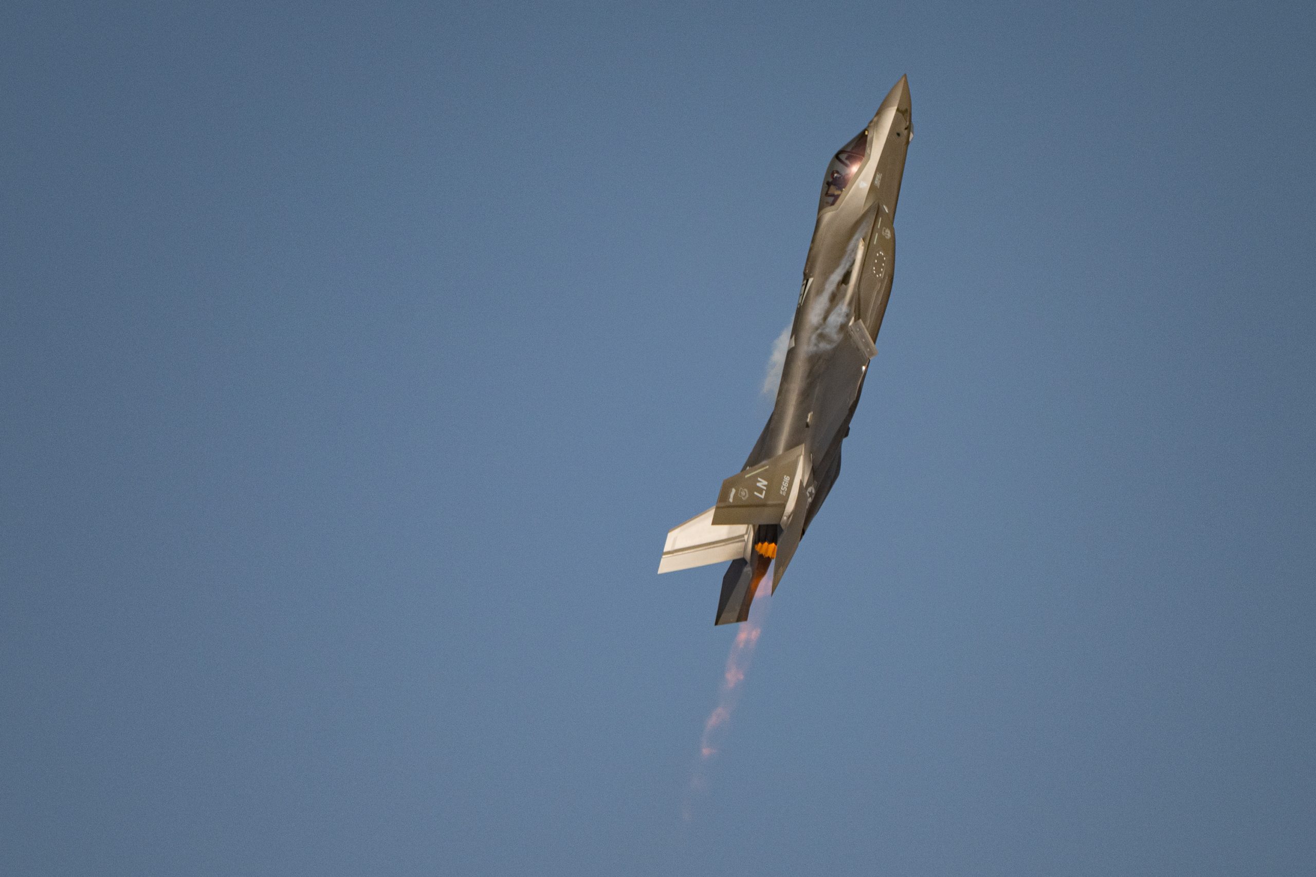 A U.S. Air Force F-35A Lightning II aircraft flown by the F-35 aerial demonstration team assigned to the 388th Fighter Wing at Hill Air Force Base, Utah, performs aerial maneuvers Nov. 15, 2025, over Al Maktoum International Airport in Dubai, United Arab Emirates. The fifth-generation stealth fighter rehearsed its performance prior to the Dubai Airshow 2025. (U.S. Air Force photo by Tech. Sgt. Justin Norton)