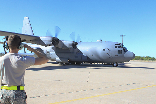An EC-130H Compass Call prepares to take off to execute the first training mission with an upgraded cockpit acquired via the avionic viability program at Davis-Monthan AFB, Ariz., on July 11, 2016. One of the aircraft assigned to the base's 55th Electronic Combat Group is deployed to Poland for training. USAF photo.