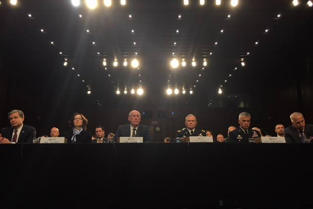 From left to right, FBI Director Christopher Wray, CIA Director Gina Haspel, Director of National Intelligence Dan Coats, DIA Director Gen. Robert Ashley, NSA Director Gen. Paul Nakasone and National Geospatial-Intelligence Agency Director Robert Cardillo testify before the Senate Select Committee on Intelligence in Washington, D.C., on Jan. 29, 2019. Office of the Director of National Intelligence photo.