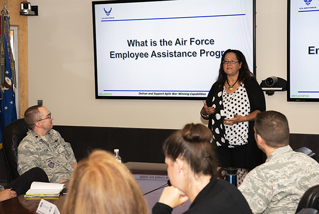 Air Force Employee Assistance Program Manager Danna Plewe briefs personnel on the benefits of the EAP at Schriever AFB, Colo., on Aug. 7, 2019. Air Force photo by SSgt. Matthew Coleman-Foster.
