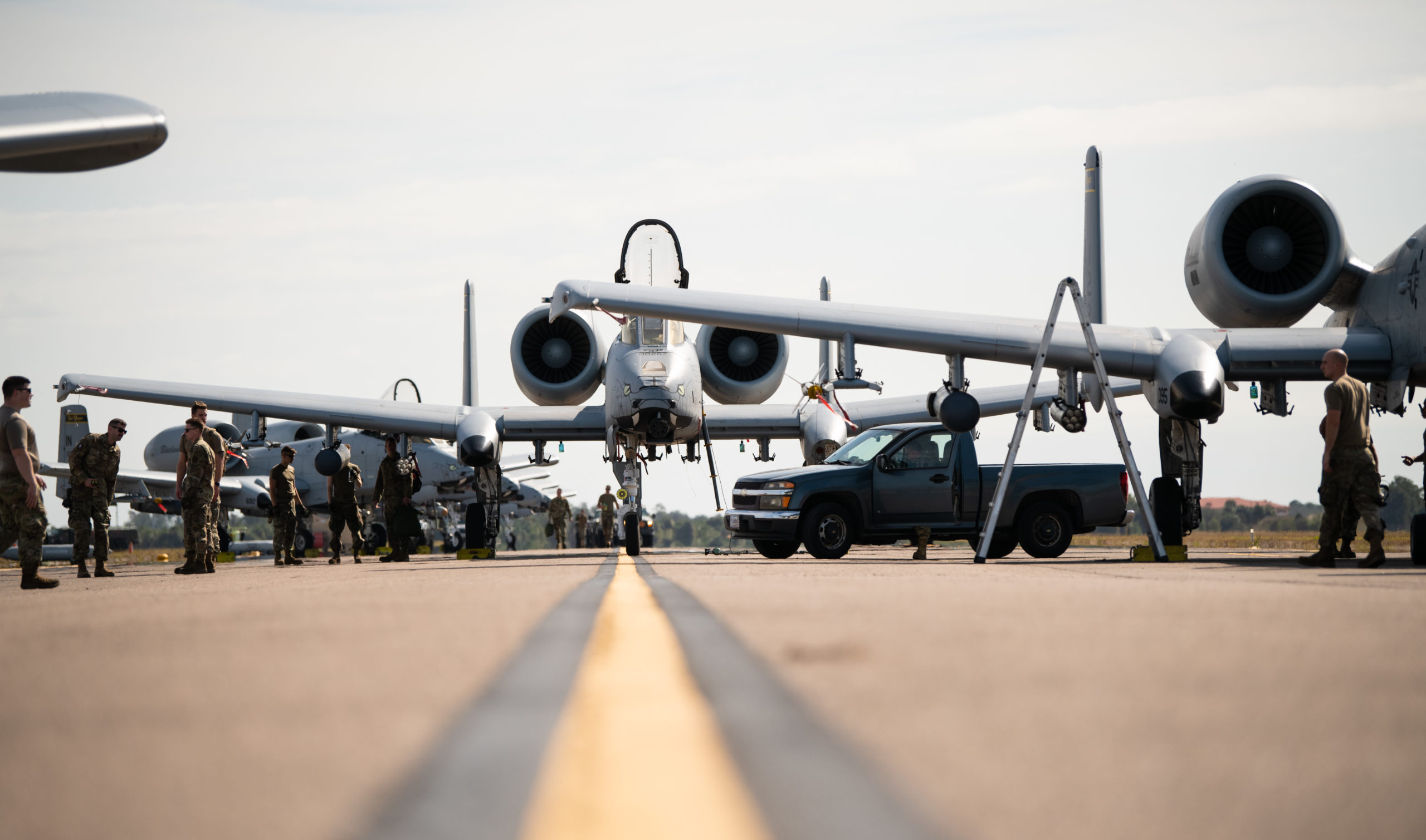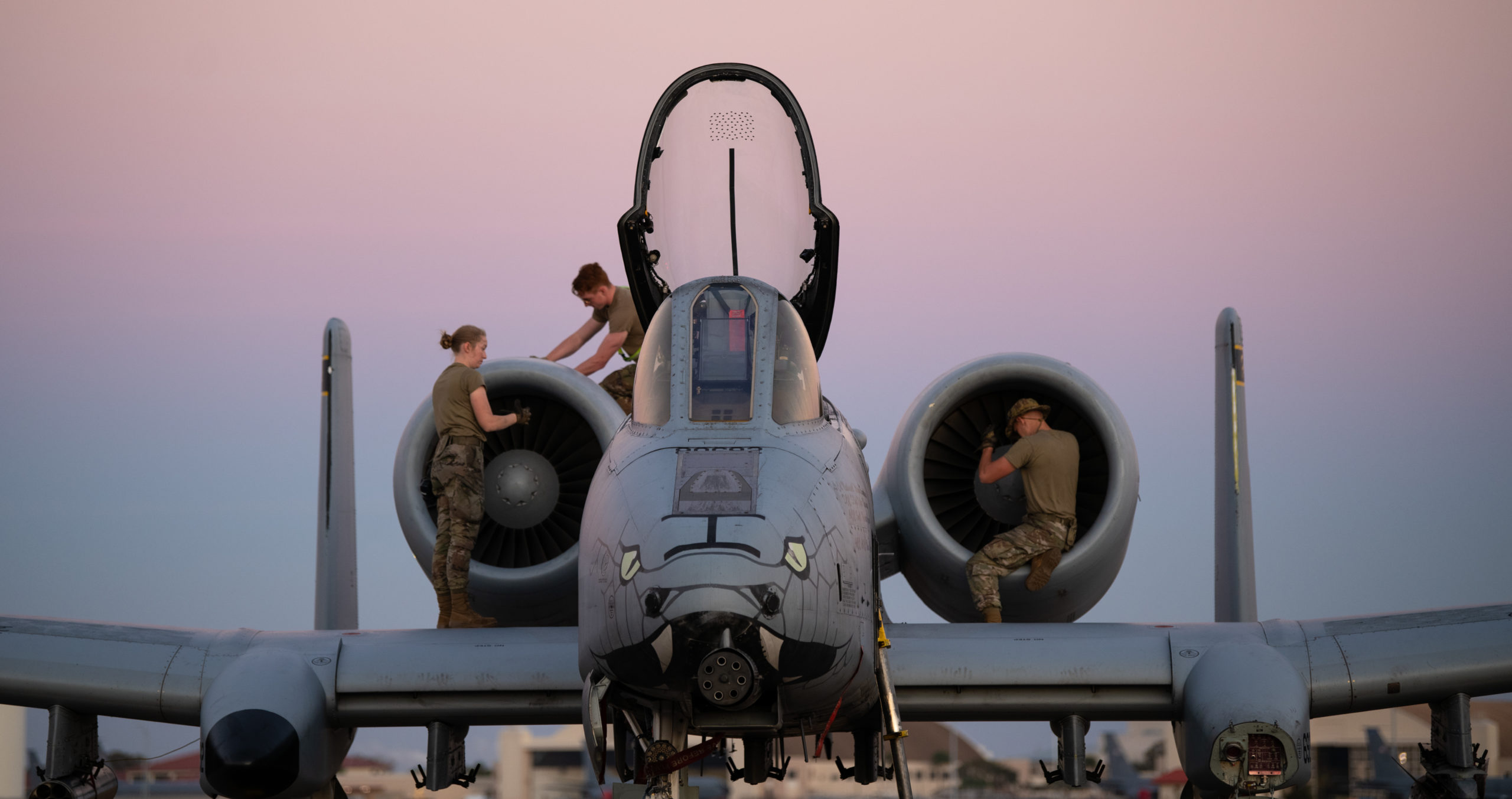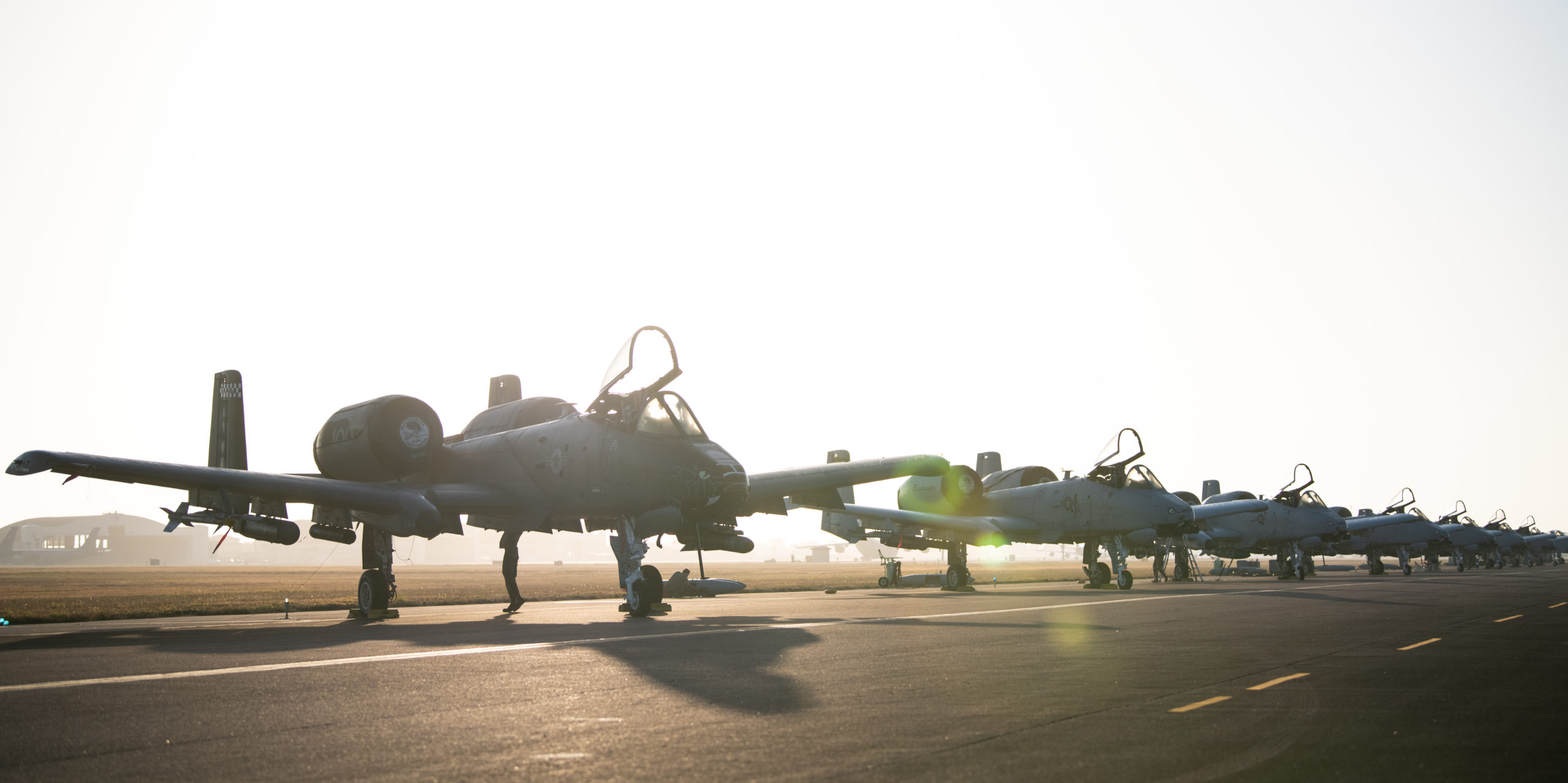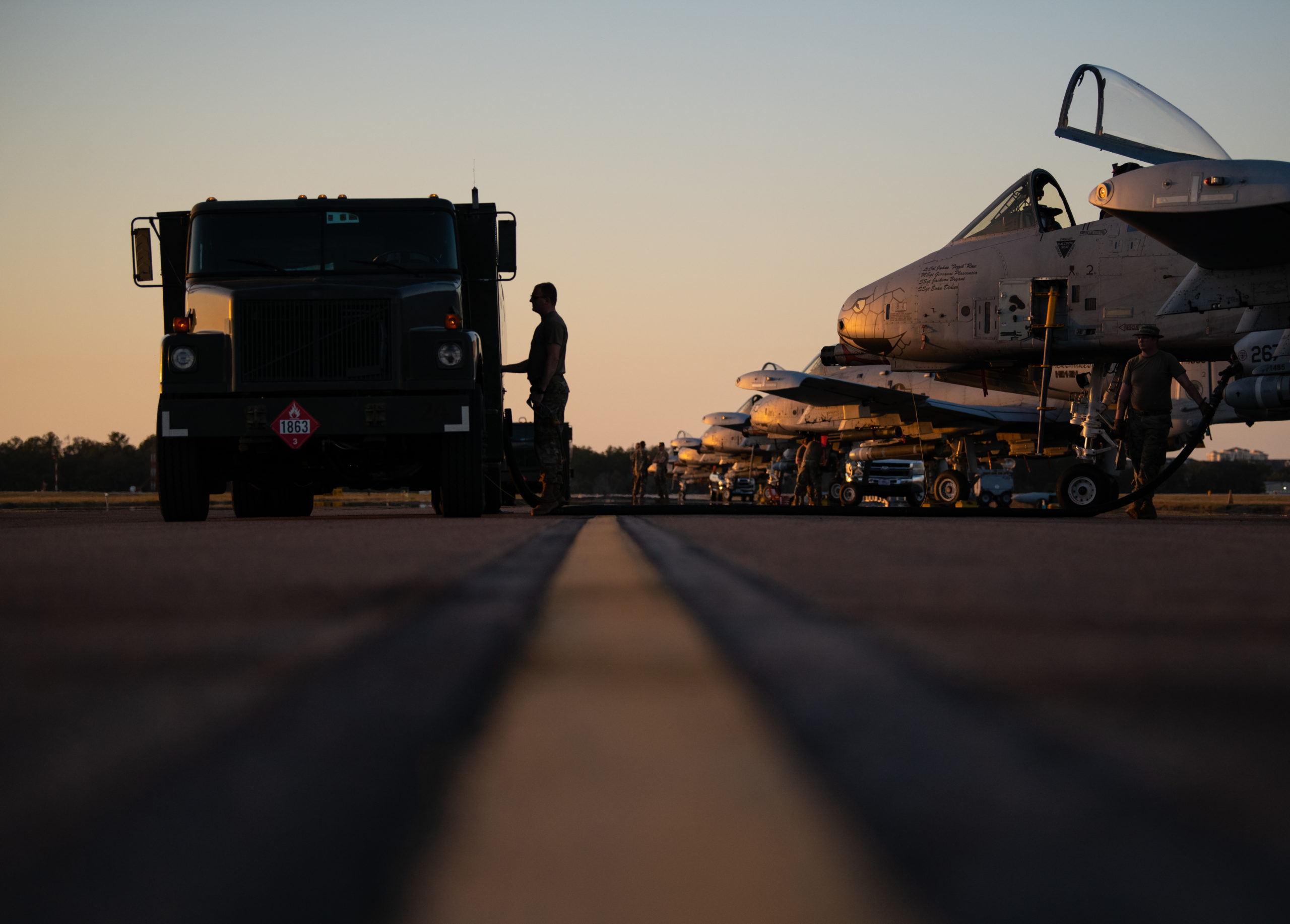 The sun rises over A-10C Thunderbolt II aircraft assigned to the 122nd Fighter Wing, Indiana Air National Guard during Guardian Blitz at MacDill Air Force Base, Florida, Jan. 25, 2023. Guardian Blitz is the 122nd Fighter Wing’s final training exercise with the A-10C Thunderbolt II before converting to the F-16 Fighting Falcon aircraft. U.S. Air National Guard photo by Staff Sgt. Kathleen LaCorte