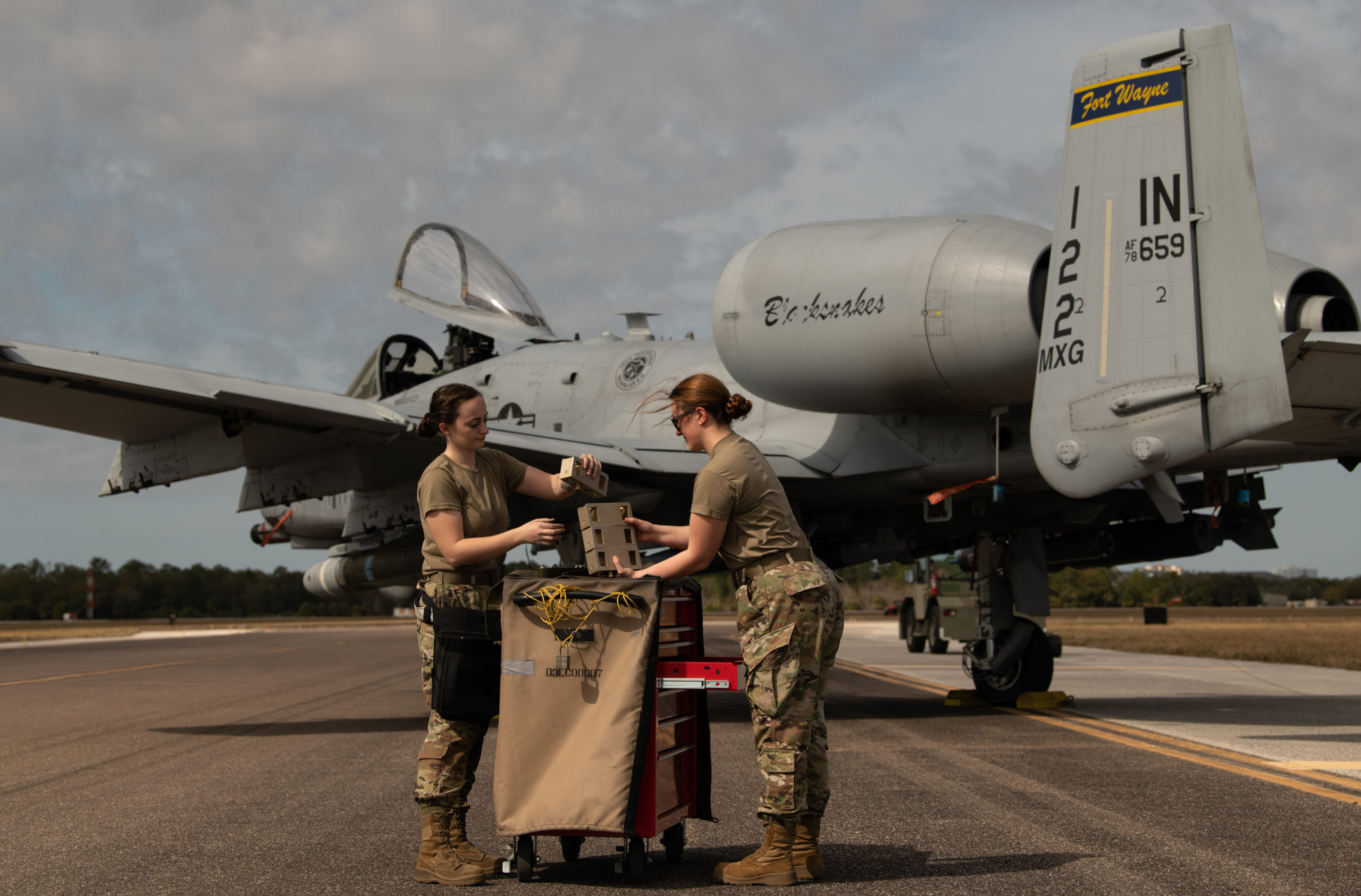 From left, U.S. Air Force Senior Airman Elizabeth A. Witvliet, Staff Sgt. David Ghent and Senior Airman Logan Brown, all aircraft maintenance crew chiefs assigned to the 122nd Fighter Wing, Indiana Air National Guard perform a post-flight inspection on an A-10C Thunderbolt II aircraft during Guardian Blitz at MacDill Air Force Base, Feb. 2, 2023. During the final exercise with the A-10C before converting to the F-16 Fighting Falcon aircraft, the 122nd FW trained on maneuvers and logistics in a deployed environment with the main force positioned at MacDill Air Force Base and a contingency force at Moody Air Force Base. (U.S. Air National Guard photo by Staff Sgt. Kathleen LaCorte)