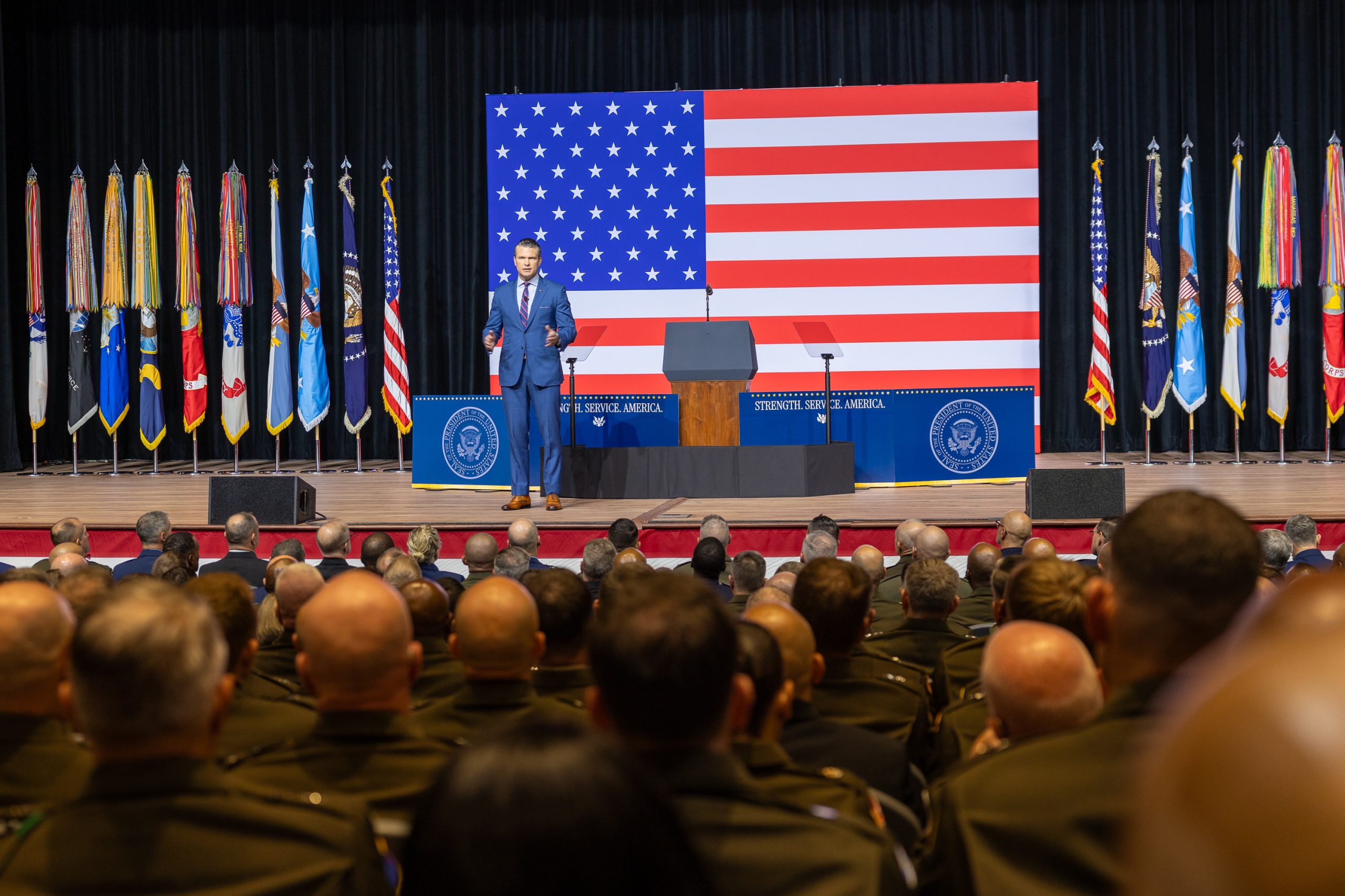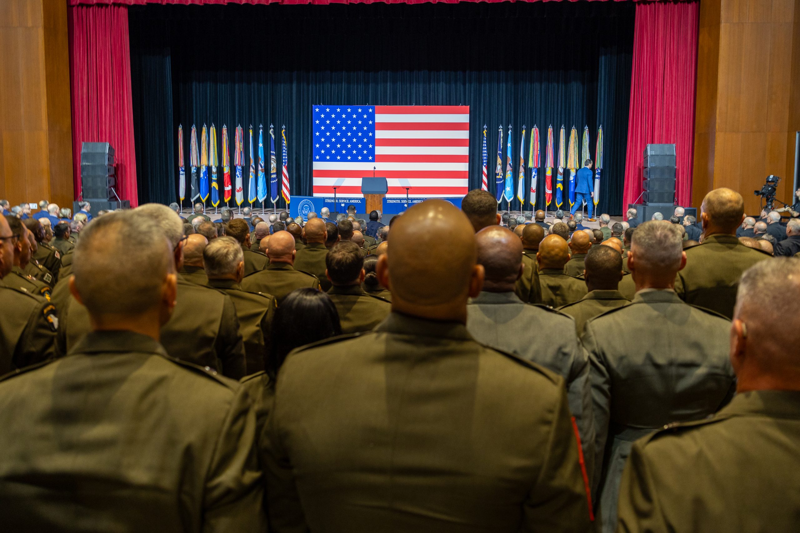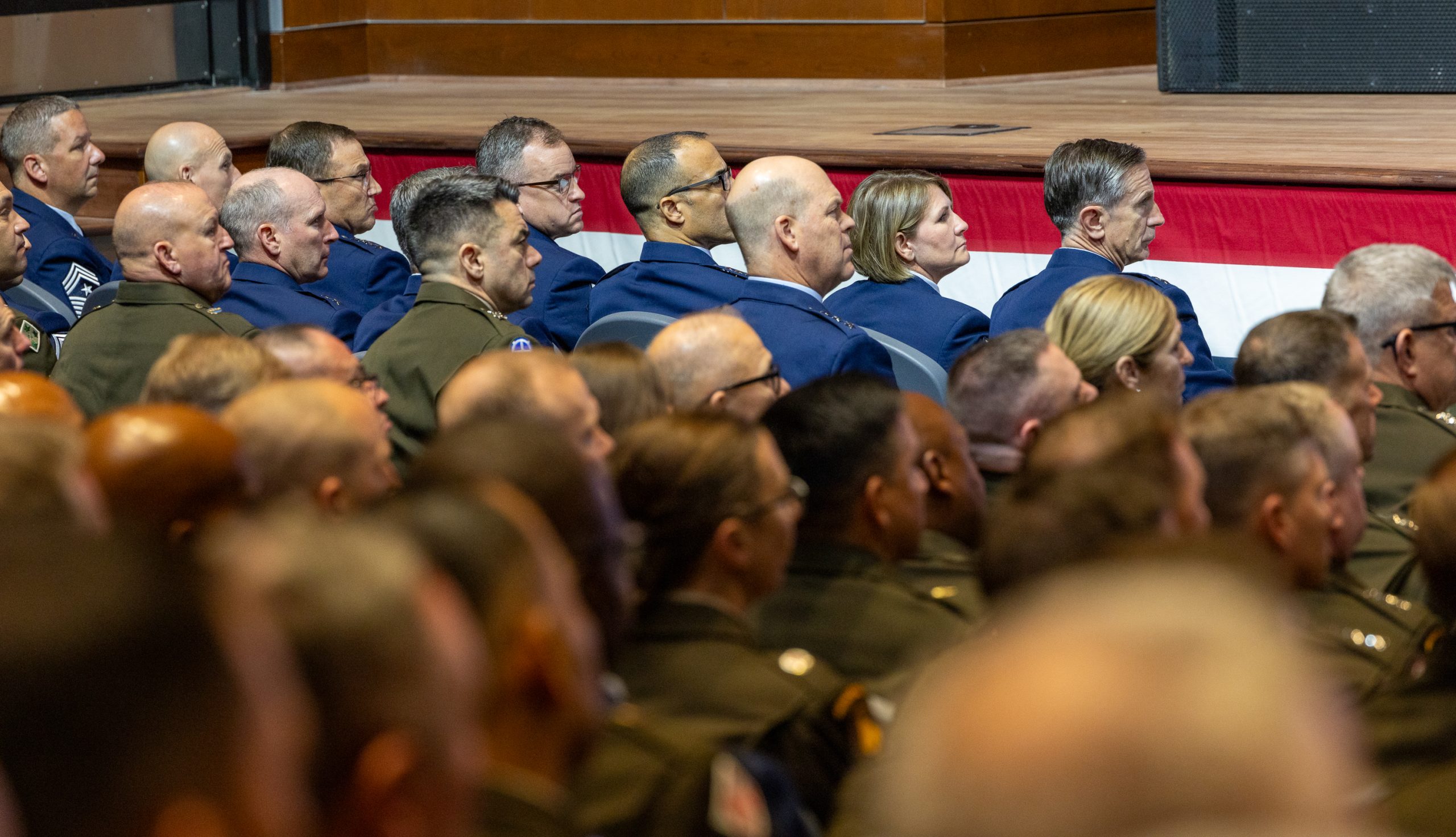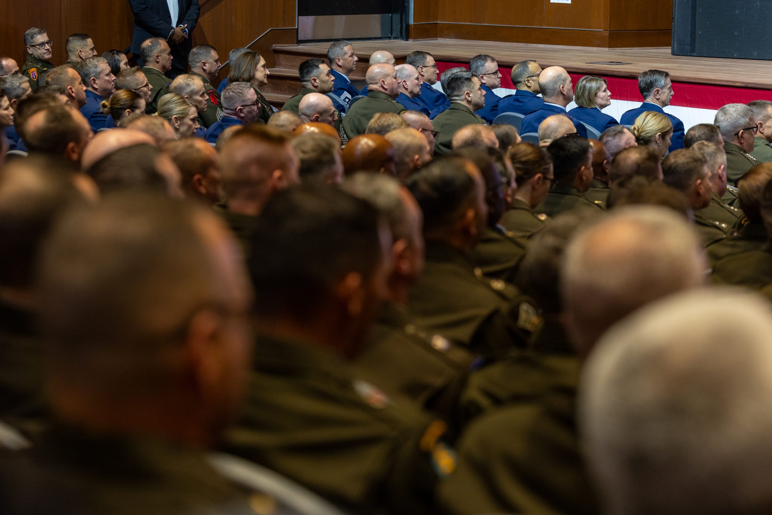 The scale of the Quantico meeting was without recent precedent. Many of the generals and admirals and their senior enlisted leaders were bused to this base, which was under tight security. Two hours before Hegseth’s address, the room was already filling up. Air Force Chief of Staff Gen. David W. Allvin and Chief of Space Operations Gen. B. Chance Saltzman were seated in the front row along with the rest of the Joint Chiefs of Staff, including Chairman Air Force Gen. Dan Caine, who introduced Hegseth.