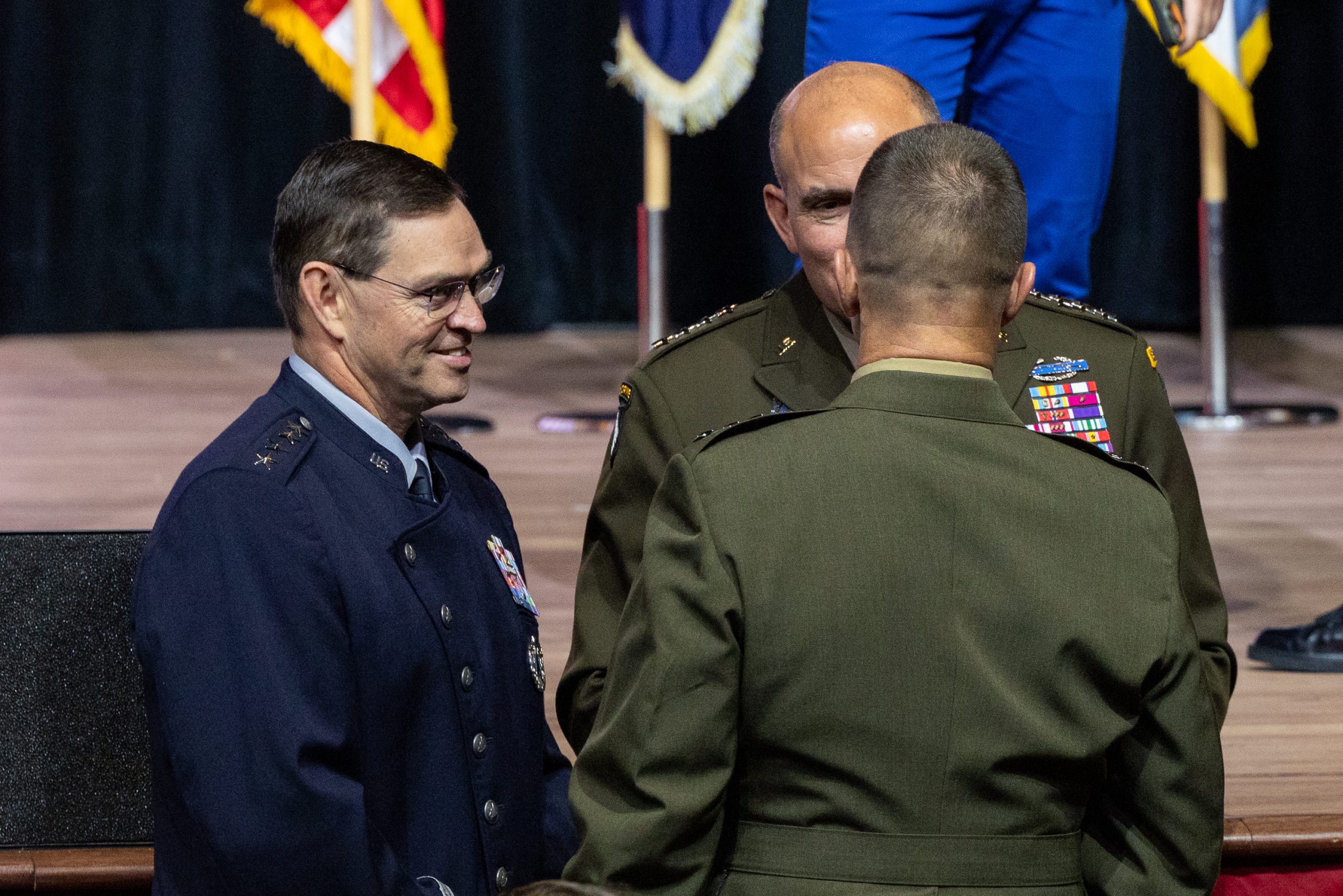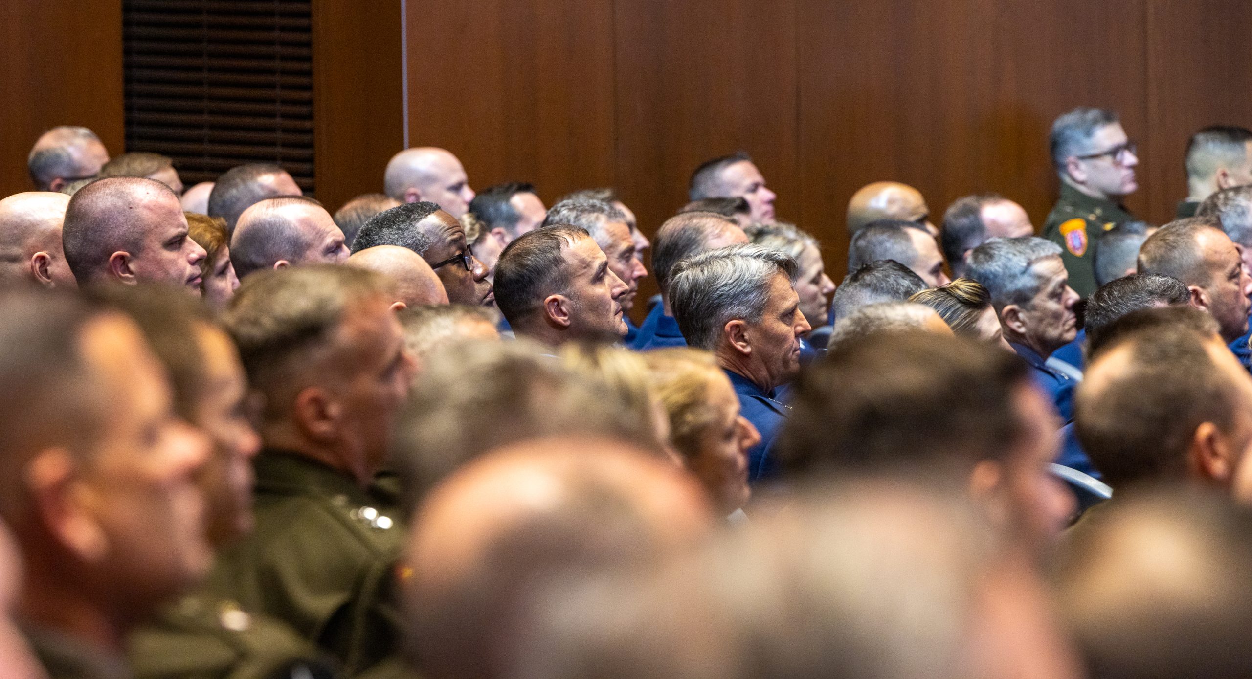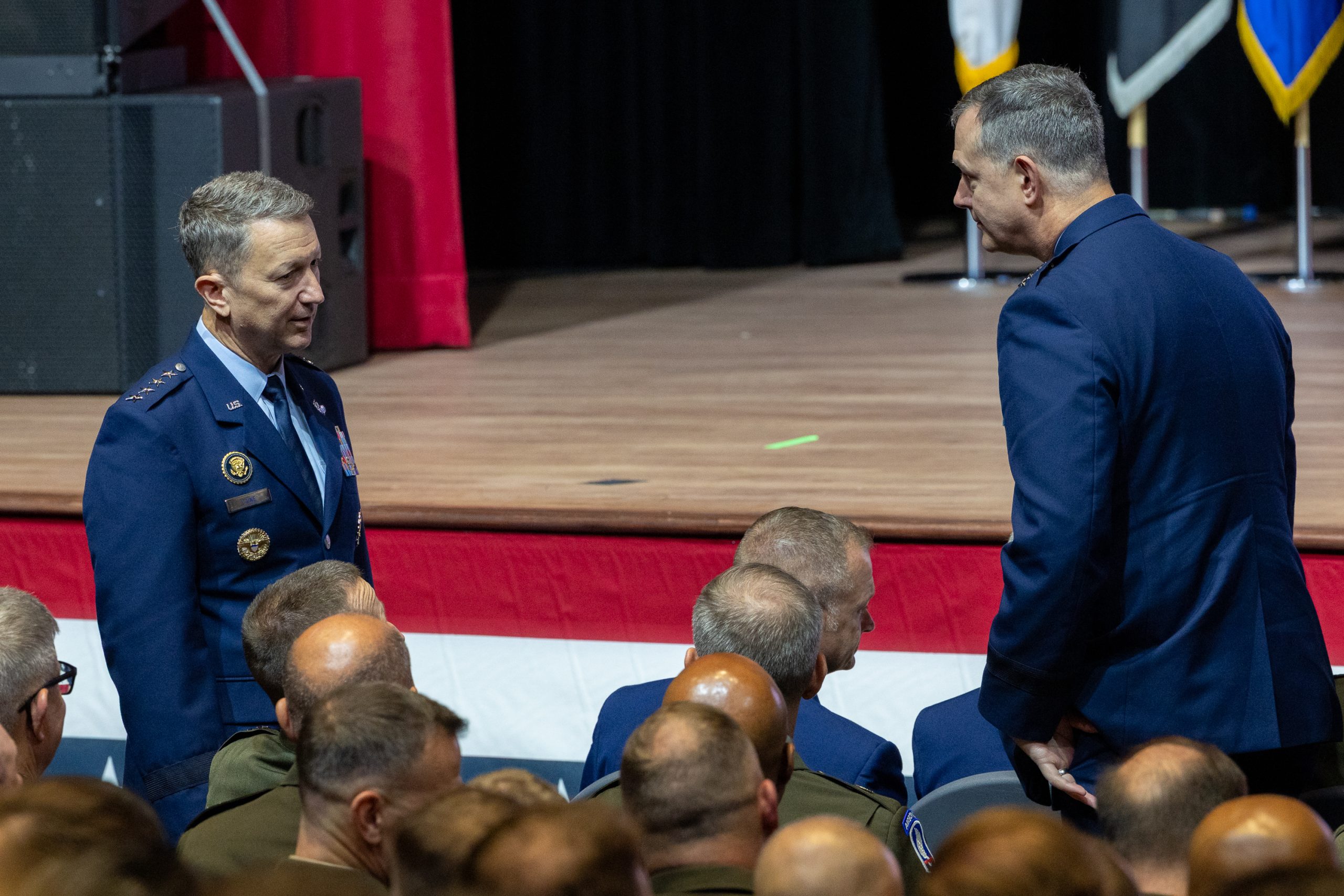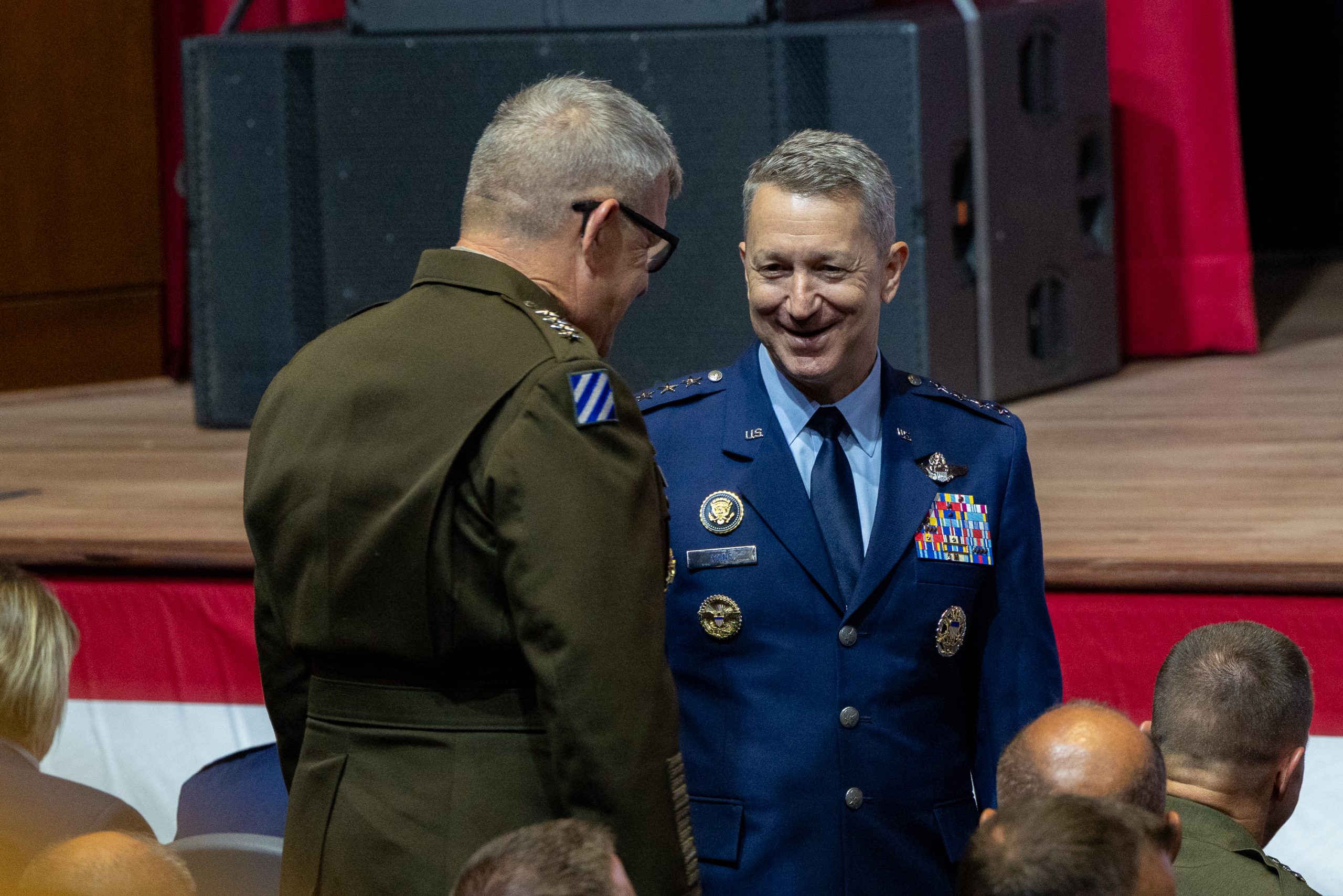 The scale of the Quantico meeting was without recent precedent. Many of the generals and admirals and their senior enlisted leaders were bused to this base, which was under tight security. Two hours before Hegseth’s address, the room was already filling up. Air Force Chief of Staff Gen. David W. Allvin and Chief of Space Operations Gen. B. Chance Saltzman were seated in the front row along with the rest of the Joint Chiefs of Staff, including Chairman Air Force Gen. Dan Caine, who introduced Hegseth.
