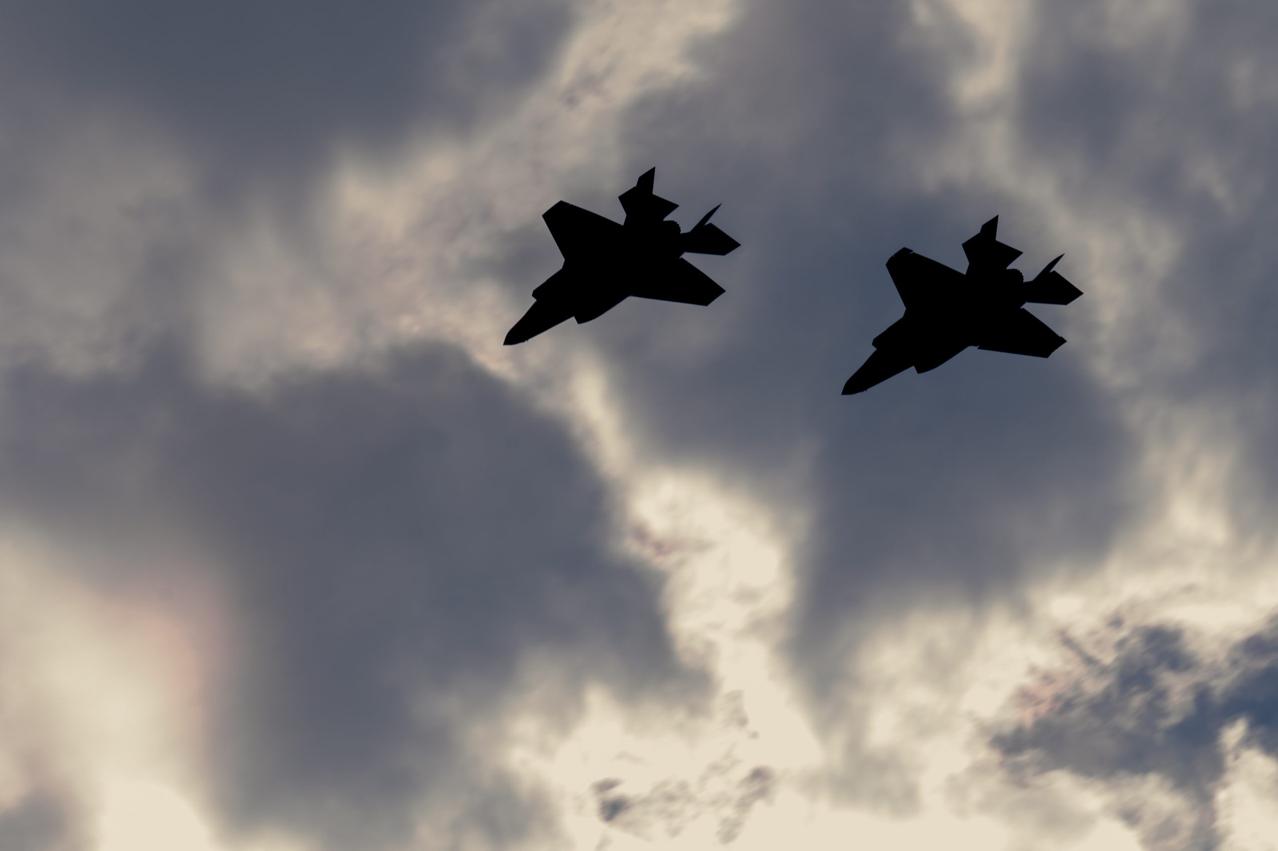 Two U.S. Air Force F-35A Lightning IIs assigned to the 355th Expeditionary Fighter Squadron prepare to land at Marine Corps Air Station Futenma, Japan, during a routine 18th Wing readiness exercise at Kadena Air Base, Japan, May 6, 2025. During the exercise, the 355th EFS staged out of Futenma to simulate generating combat airpower from a dispersed location. (U.S. Air Force photo by Senior Airman Catherine Daniel)
