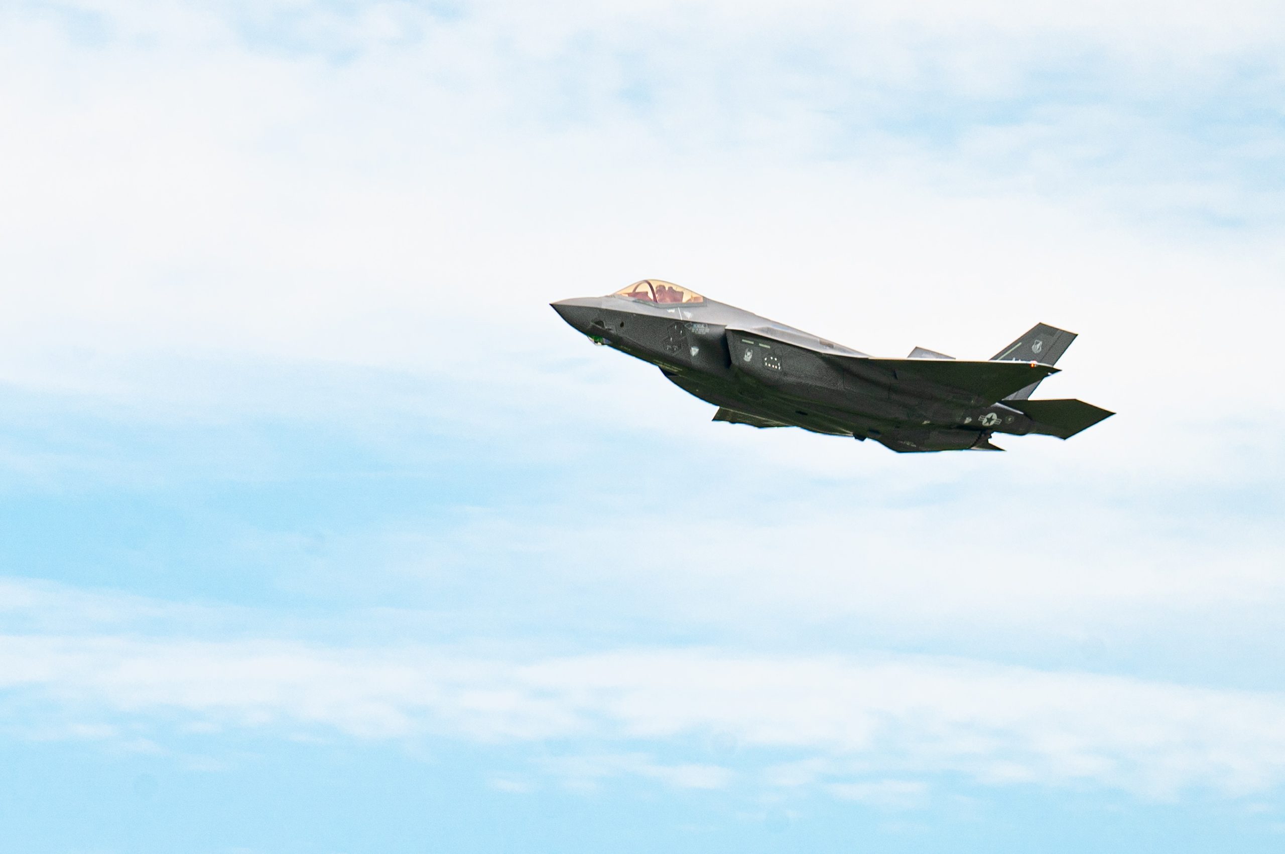 A U.S. Air Force F-35A Lightning II assigned to the 355th Expeditionary Fighter Squadron, Eielson Air Force Base, Alaska, prepares to land at Marine Corps Air Station Futenma, Japan during a routine 18th Wing readiness exercise at Kadena Air Base, Japan May 6, 2025. During the exercise, the 355th EFS staged out of Futenma to simulate generating combat airpower from a dispersed location. (U.S. Air Force photo by Senior Airman Catherine Daniel)