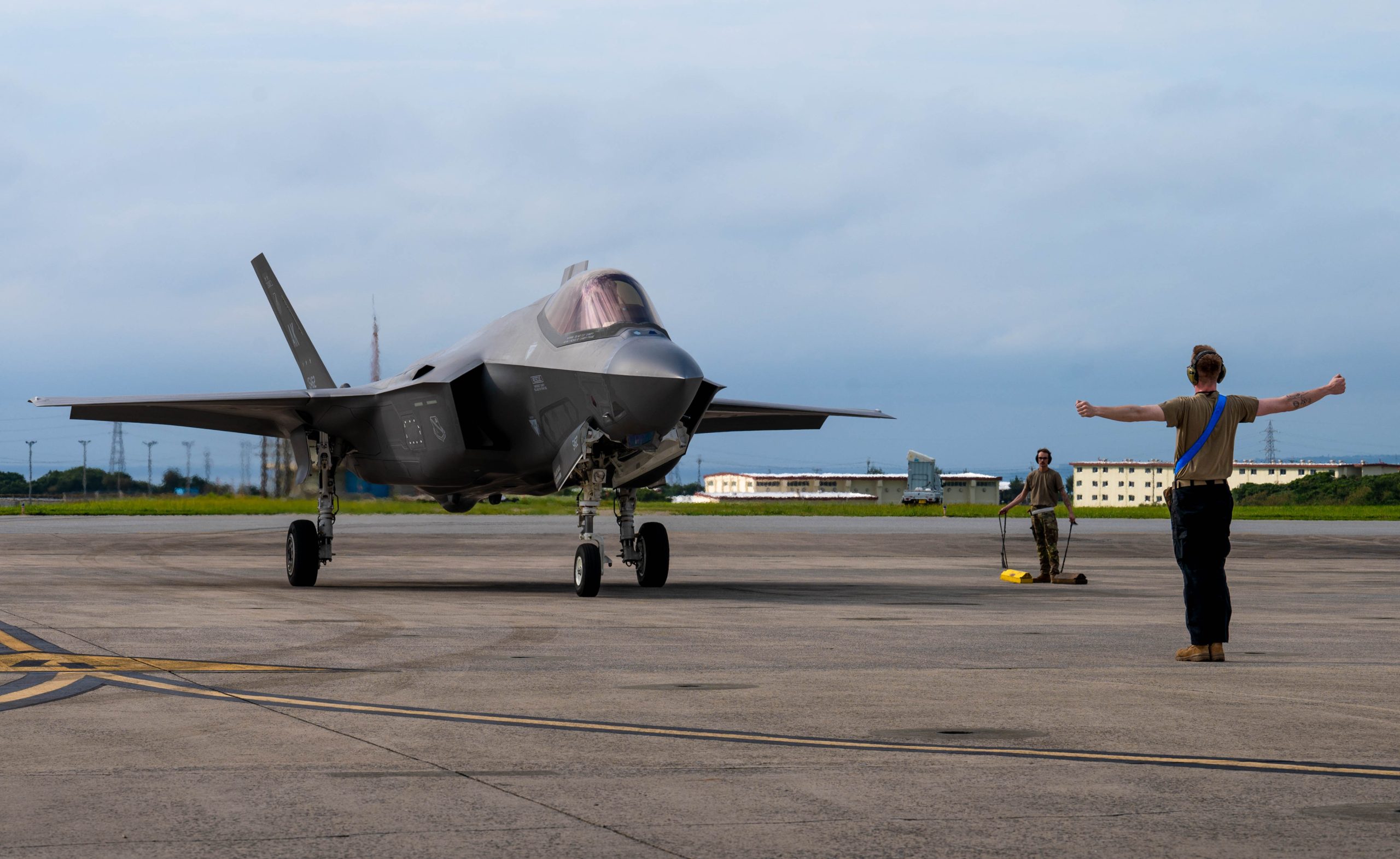 A U.S. Air Force crew chief assigned to the 355th Expeditionary Fighter Generation Squadron marshals an F-35A Lightning II into a parking spot at Marine Corps Air Station Futenma, Japan, during a routine 18th Wing readiness exercise at Kadena Air Base, Japan, May 6, 2025. The U.S. Air Force continues to work on its ability to meet new challenges in dynamic environments. In line with this direction, U.S. Pacific Air Forces is constantly evaluating and validating new warfighting concepts. (U.S. Air Force photo by Senior Airman Catherine Daniel)