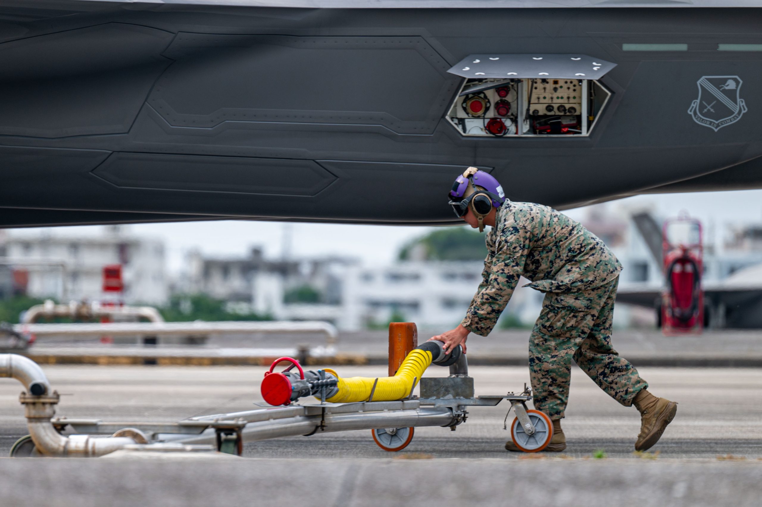 U.S. Marine Corps bulk fuel specialists assigned to the 1st Marine Aircraft Wing preform hot-pit refueling on F-35A Lightning IIs assigned to the 355th Expeditionary Fighter Squadron at Marine Corps Air Station Futenma, Japan during a routine 18th Wing readiness exercise at Kadena Air Base, Japan, May 6, 2025. Exercising elements of agile combat employment enables Airmen to operate from locations with varying levels of capacity and support while they practice syncing with joint force teams to project air power from multiple locations. (U.S. Air Force photo by Senior Airman Catherine Daniel)