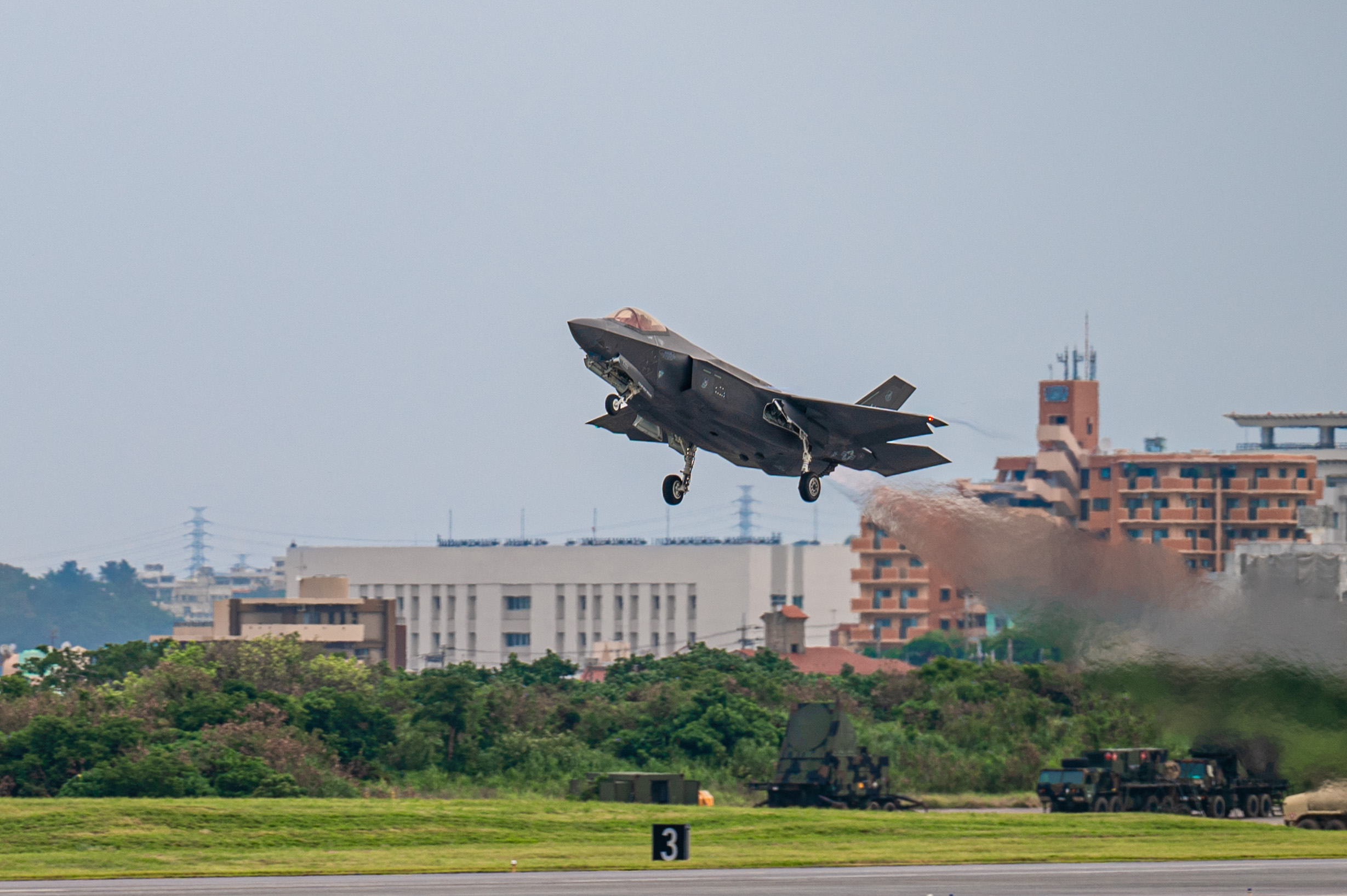 A U.S. Air Force F-35A Lightning II assigned to the 355th Expeditionary Fighter Squadron takes off from Marine Corps Air Station Futenma, Japan, during a routine 18th Wing readiness exercise at Kadena Air Base, Japan, May 6, 2025. During the exercise, the 355th EFS staged out of Futenma to simulate generating combat airpower from a dispersed location. (U.S. Air Force photo by Senior Airman Catherine Daniel)