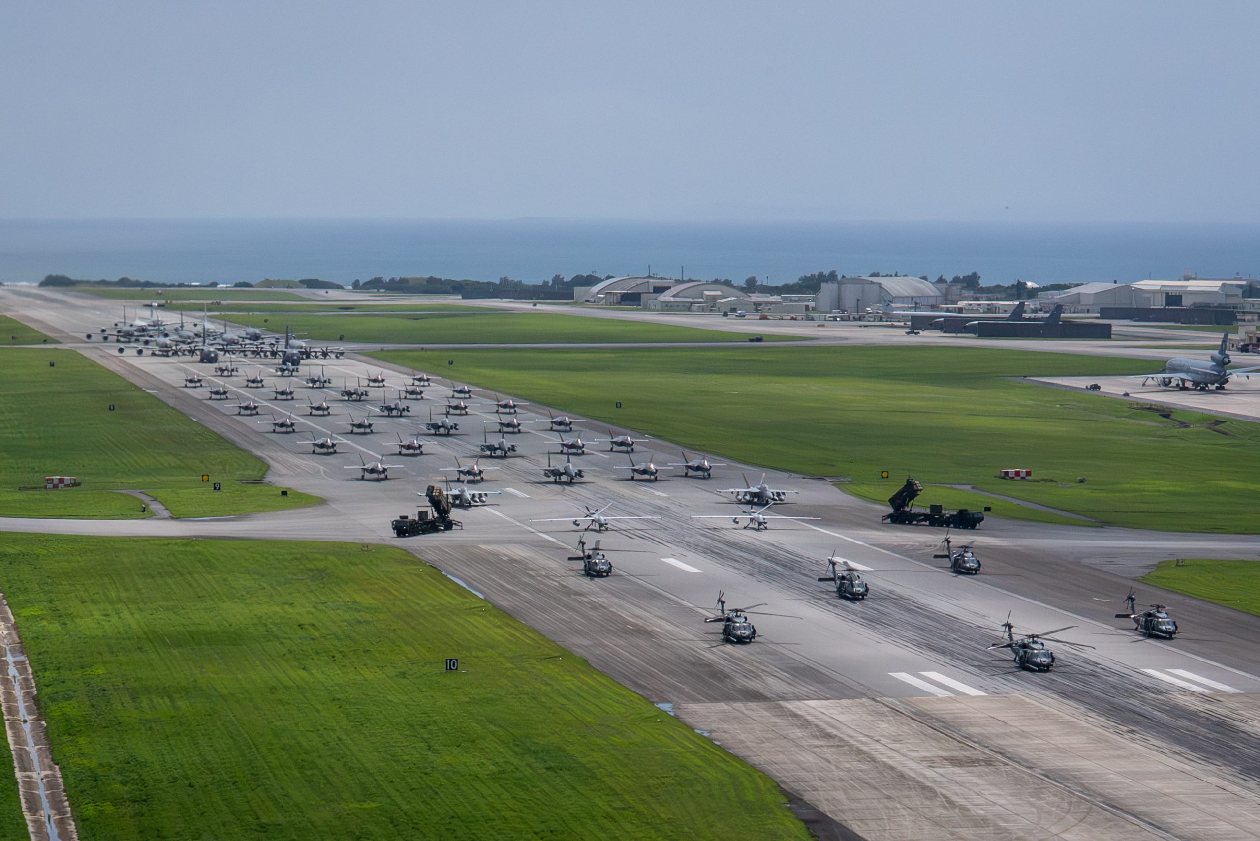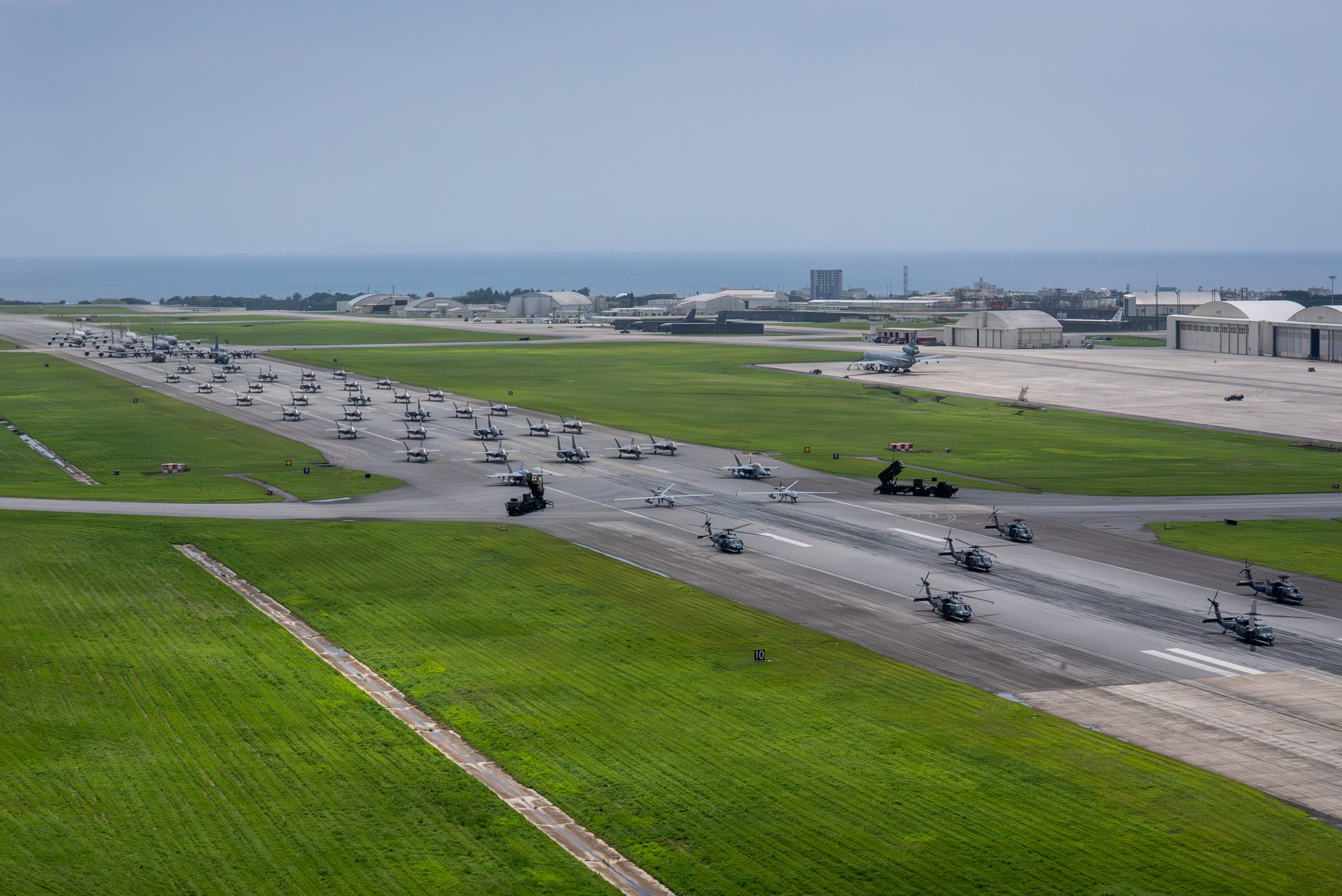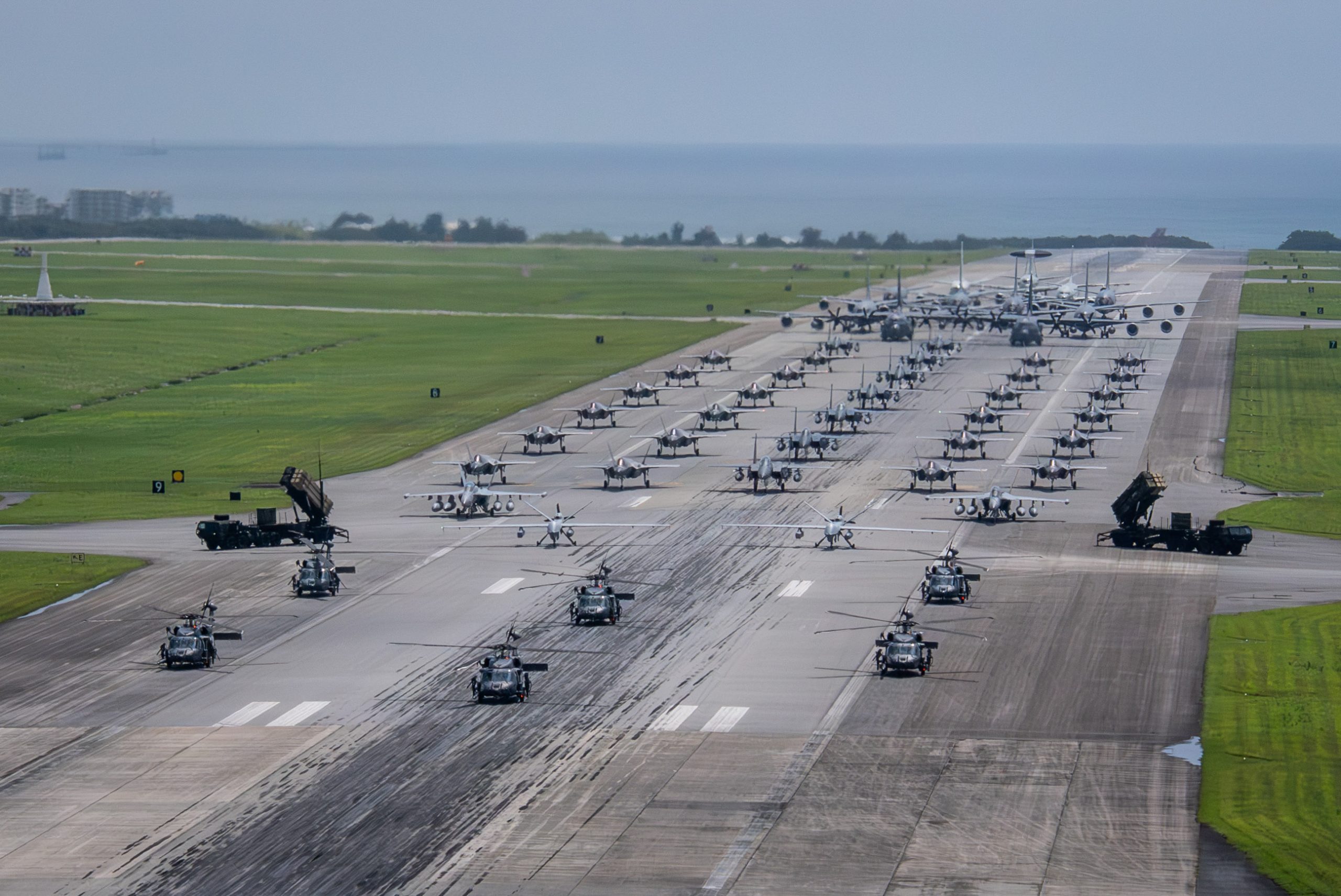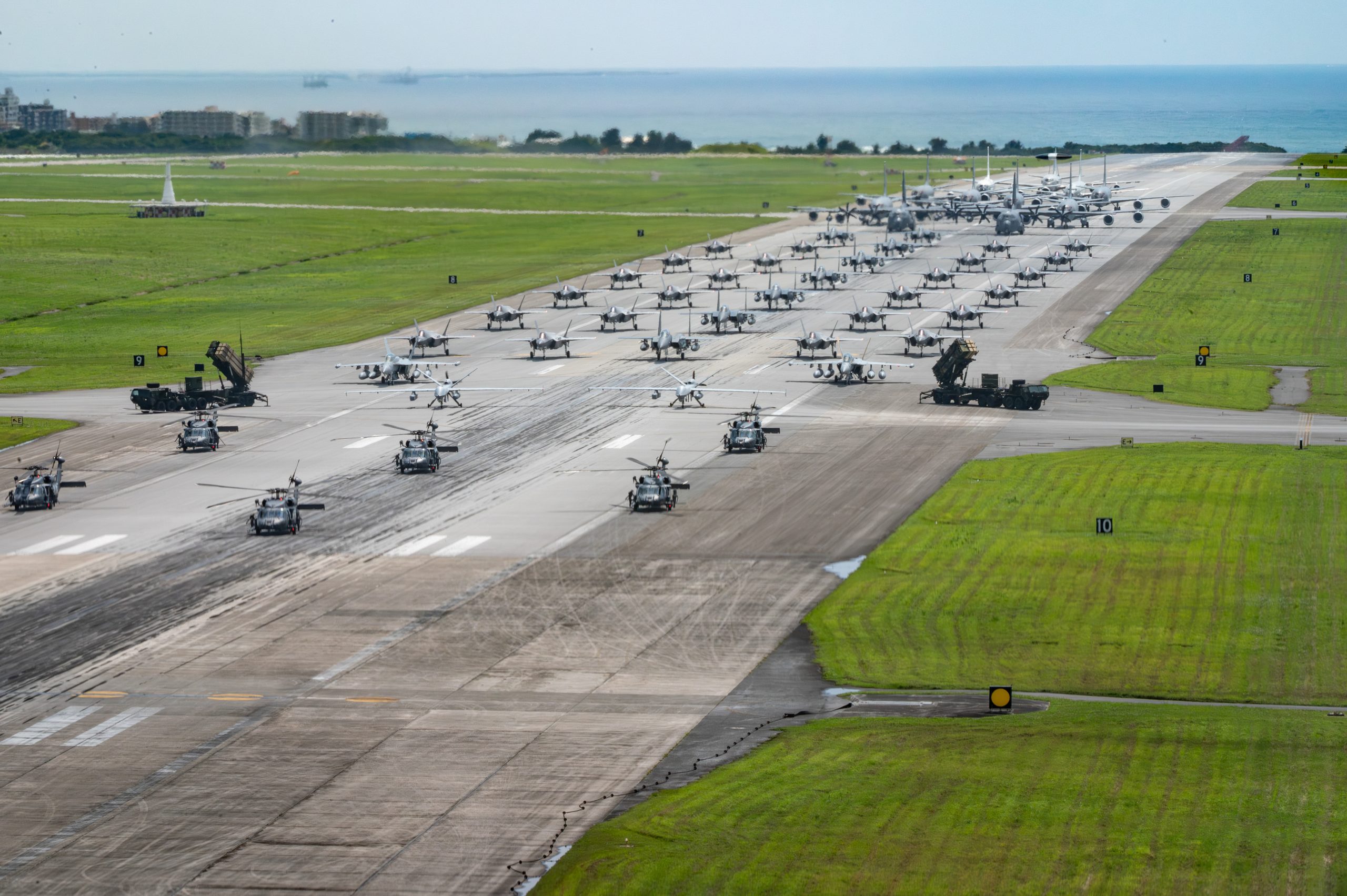 U.S. Air Force, U.S. Navy, and U.S. Marine Corps, along with U.S. Army Patriot missile batteries line up on the runway for an elephant walk during a routine operational readiness exercise at Kadena Air Base, Japan, May 6, 2025. Team Kadena showcased an array of assets, demonstrating a portion of the 100+ aircraft operating from the Keystone of the Pacific. (U.S. Air Force photo by Senior Master Sgt. Nadine Barclay)