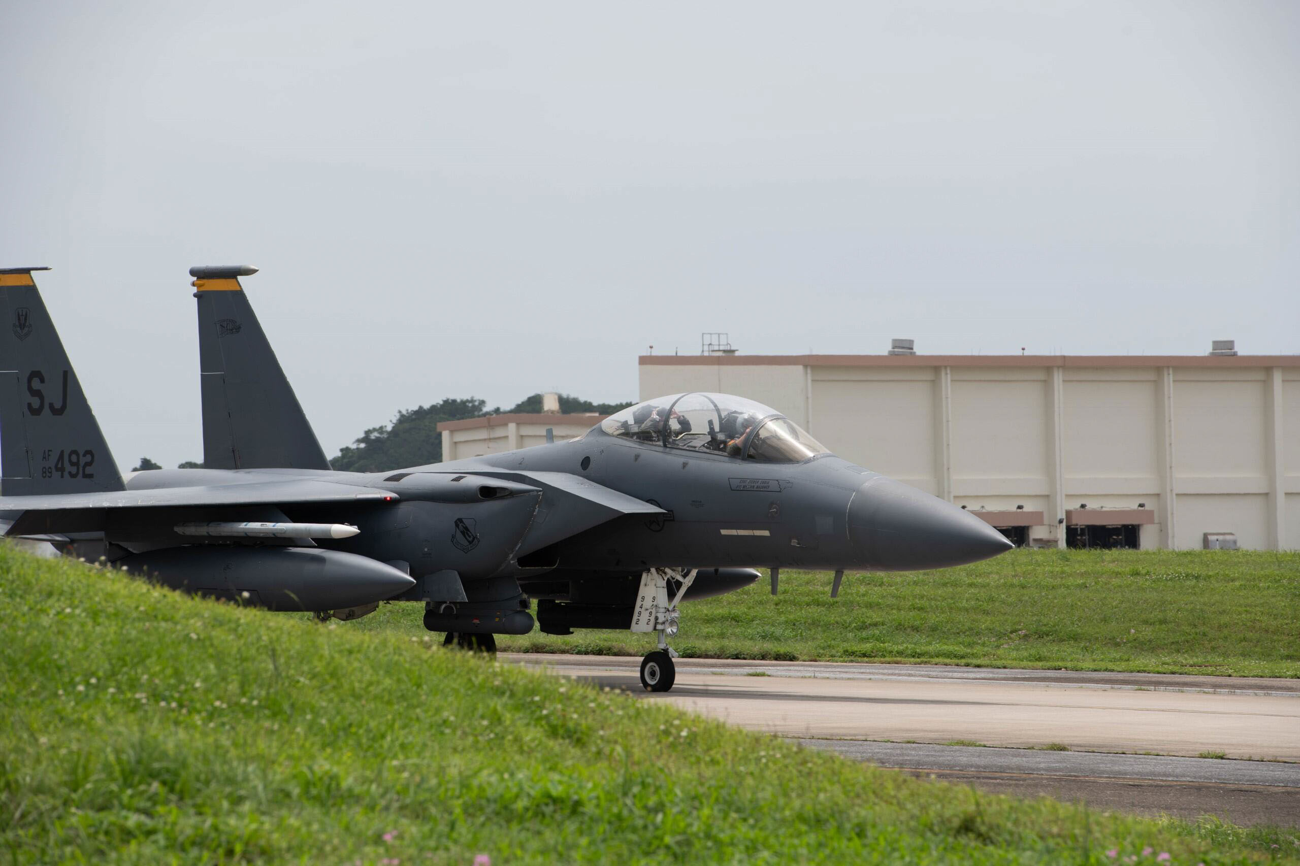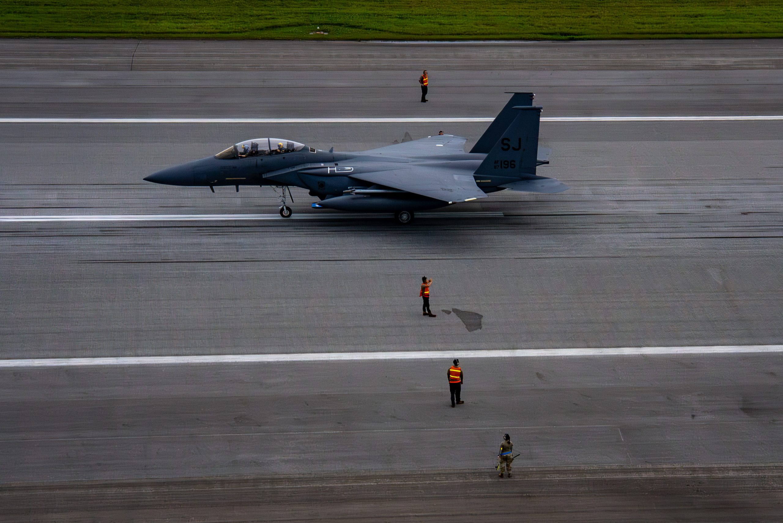 A U.S. Air Force F-15 Strike Eagle assigned to the 336th Expeditionary Fighter Squadron, Seymour Johnson Air Force Base, South Carolina, taxis down the runway for an elephant walk during a routine readiness exercise at Kadena Air Base, Japan, May 6, 2025. Team Kadena showcased an array of assets, demonstrating a portion of the 100+ aircraft operating from the Keystone of the Pacific. (U.S. Air Force photo by Airman 1st Class Amy Kelley)
