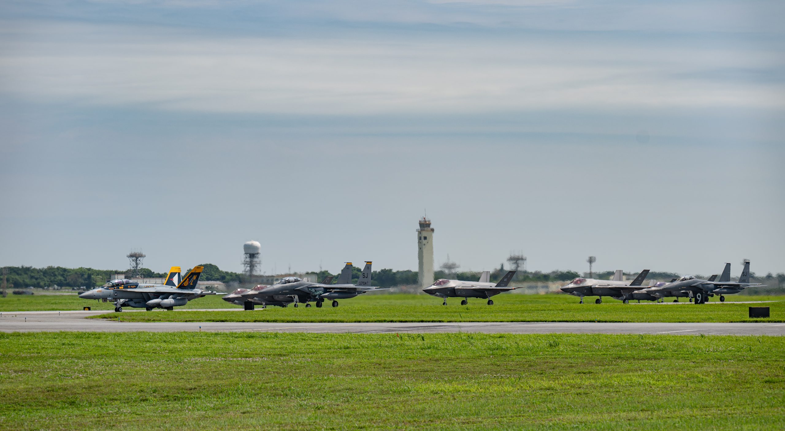 U.S. Air Force and U.S. Navy aircraft line up on the runway for an elephant walk during a routine readiness exercise at Kadena Air Base, Japan, May 6, 2025. Team Kadena showcased an array of assets, demonstrating a portion of the 100+ aircraft operating from the Keystone of the Pacific. (U.S. Air Force photo by Tech. Sgt. Micaiah Anthony)