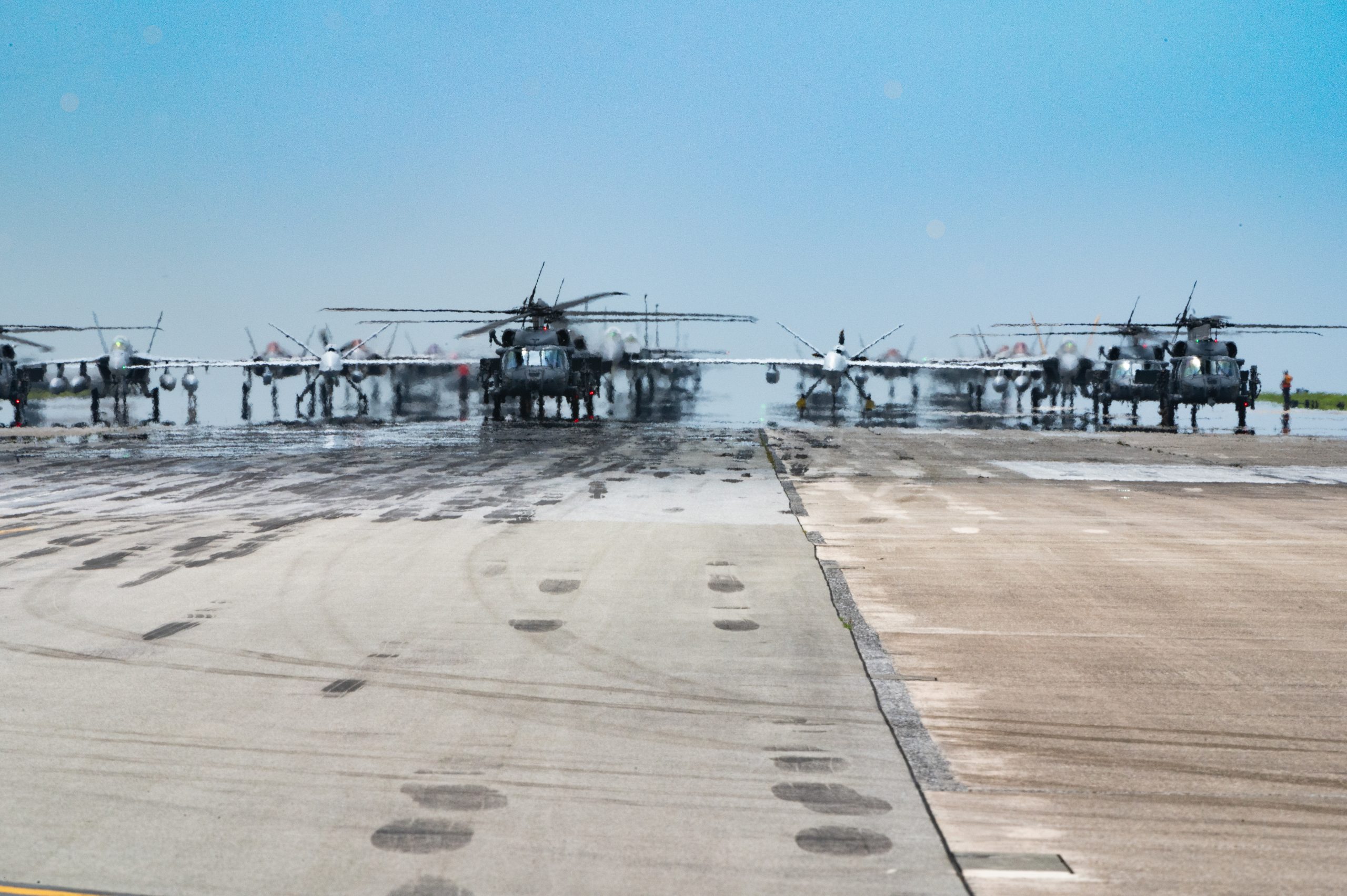 U.S. Air Force, U.S. Army and U.S. Navy assets line up on the runway for an elephant walk during a routine operational readiness exercise at Kadena Air Base, Japan, May 6, 2025. Team Kadena showcased an array of aircraft, demonstrating a portion of the 100+ aircraft operating from the Keystone of the Pacific. (U.S. Air Force photo by Senior Airman Tylir Meyer)