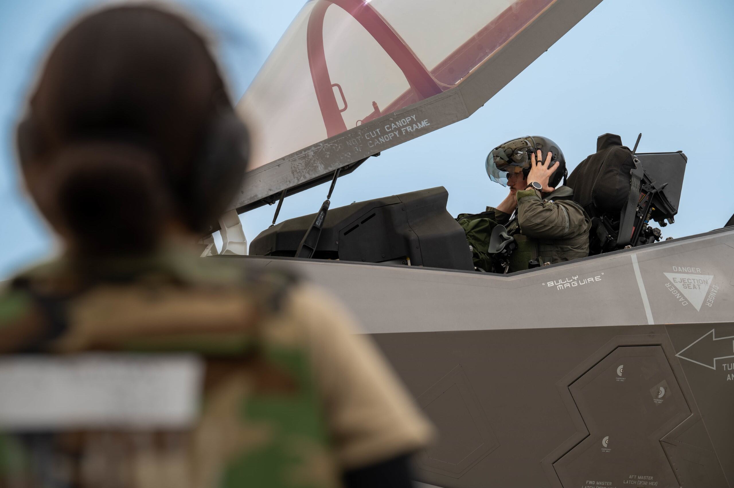 A U.S. Air Force F-35A Lightning II pilot assigned to the 355th Expeditionary Fighter Squadron taxis on the flightline at Marine Corps Air Station Futenma, Japan, during a routine 18th Wing readiness exercise at Kadena Air Base, Japan, May 6, 2025. The U.S. Air Force continues to work on its ability to meet new challenges in dynamic environments. In line with this direction, U.S. Pacific Air Forces is constantly evaluating and validating new warfighting concepts. (U.S. Air Force photo by Senior Airman Catherine Daniel)