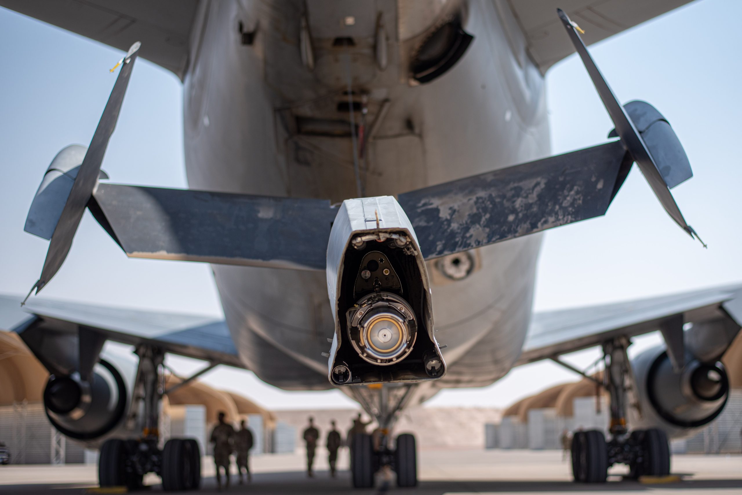U.S. Airmen from the 378th Air Expeditionary Wing view the boom of a KC-10 Extender after an inactivation ceremony for the 908th Expeditionary Air Refueling Squadron at Prince Sultan Air Base, Kingdom of Saudi Arabia, Oct. 4, 2023. The ceremony highlighted the legacy of the KC-10 after over 30 years of service within the U.S. Air Forces Central (AFCENT) Area of Responsibility. By September 2024, the U.S. Air Force’s fleet of KC-10s will be decommissioned and gradually replaced by the KC-46 aircraft. (U.S. Air Force photo by Tech. Sgt. Alexander Frank)